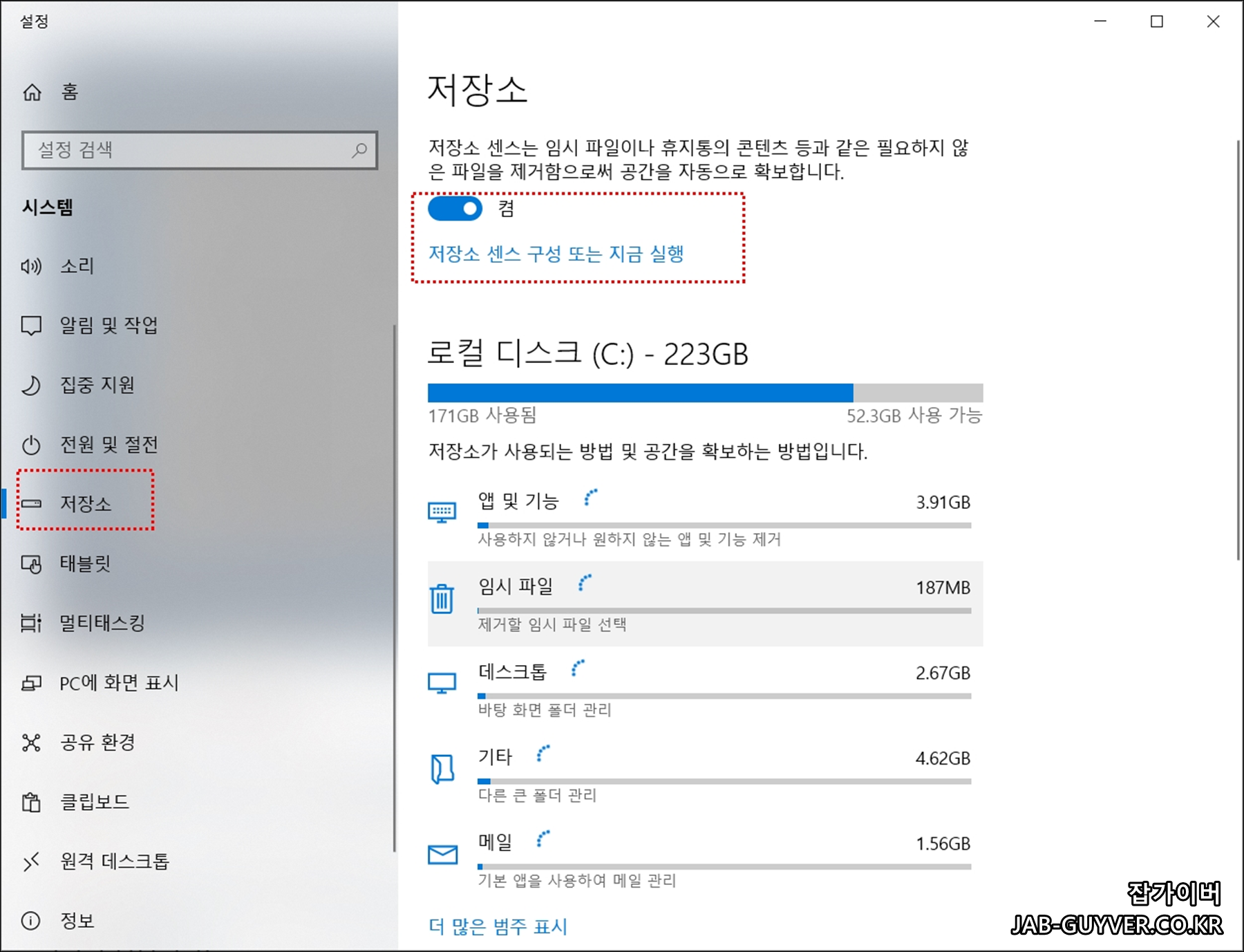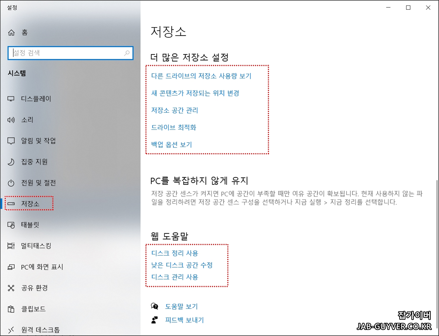 저장소 탭을 활용하면 다양한 윈도우 최적화기능으로 컴퓨터 느려짐을 해결할 수 있습니다.