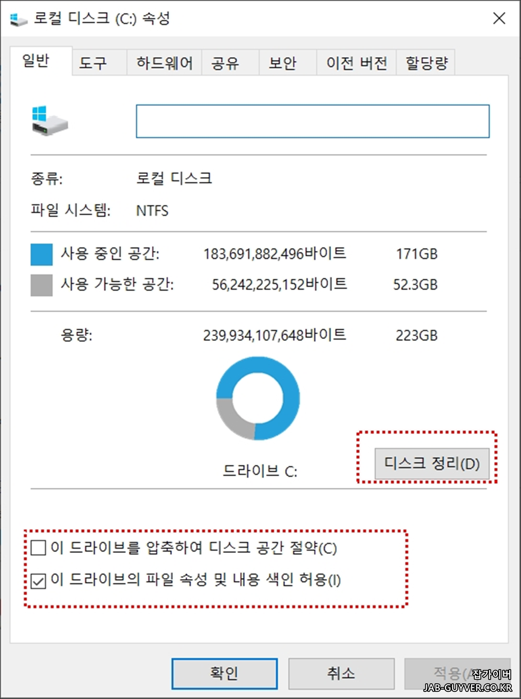 추가로 디스크공간을 압축하거나 색인을 허용해서 파일을 검색하고 찾을때 빠르게 설정합니다.