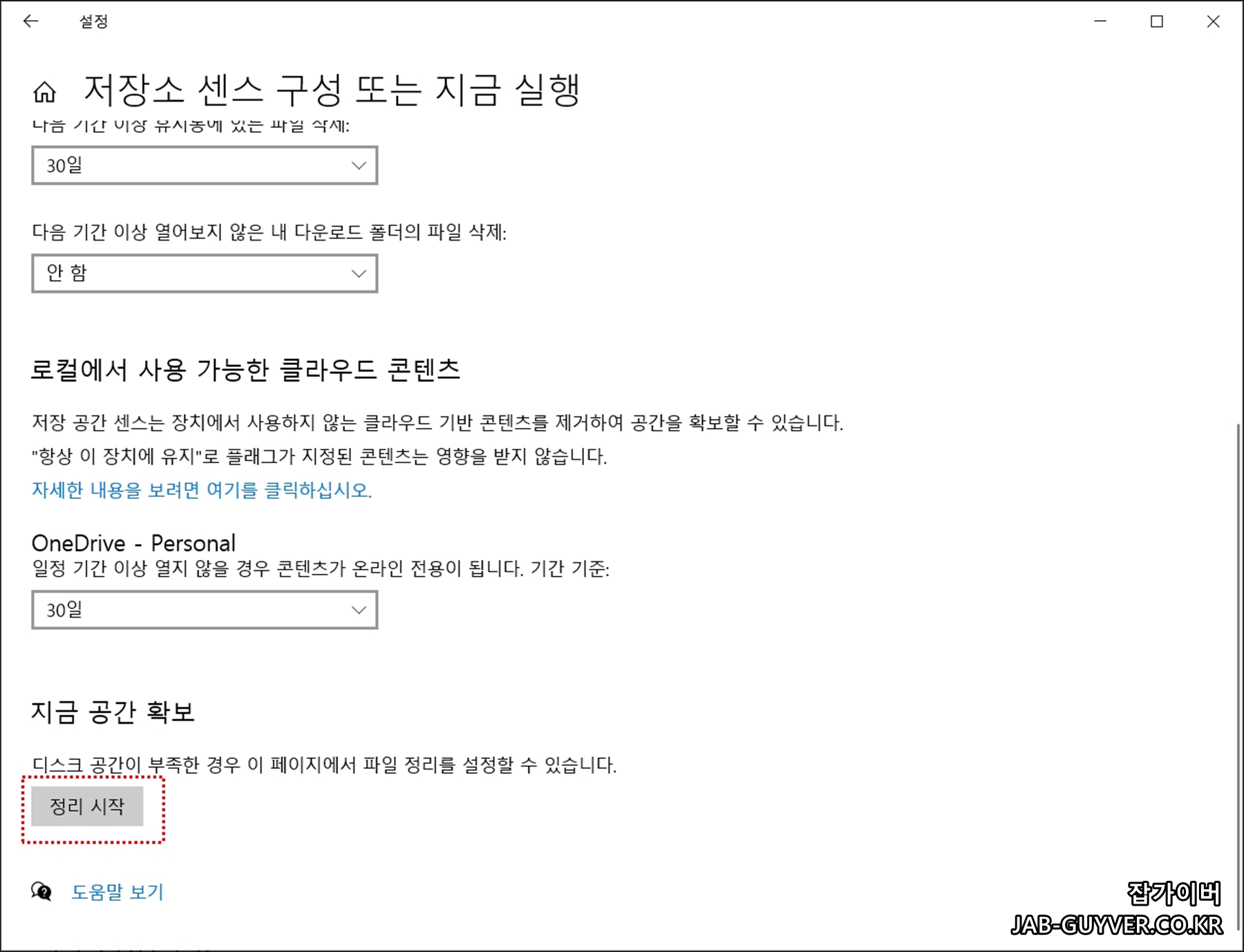 저장소 센스를 활성화하면 임시파일이나 휴지통에 생기는 필요없는 파일을 자동을 삭제해 공간을 자동으로 확보하도록 설정합니다.