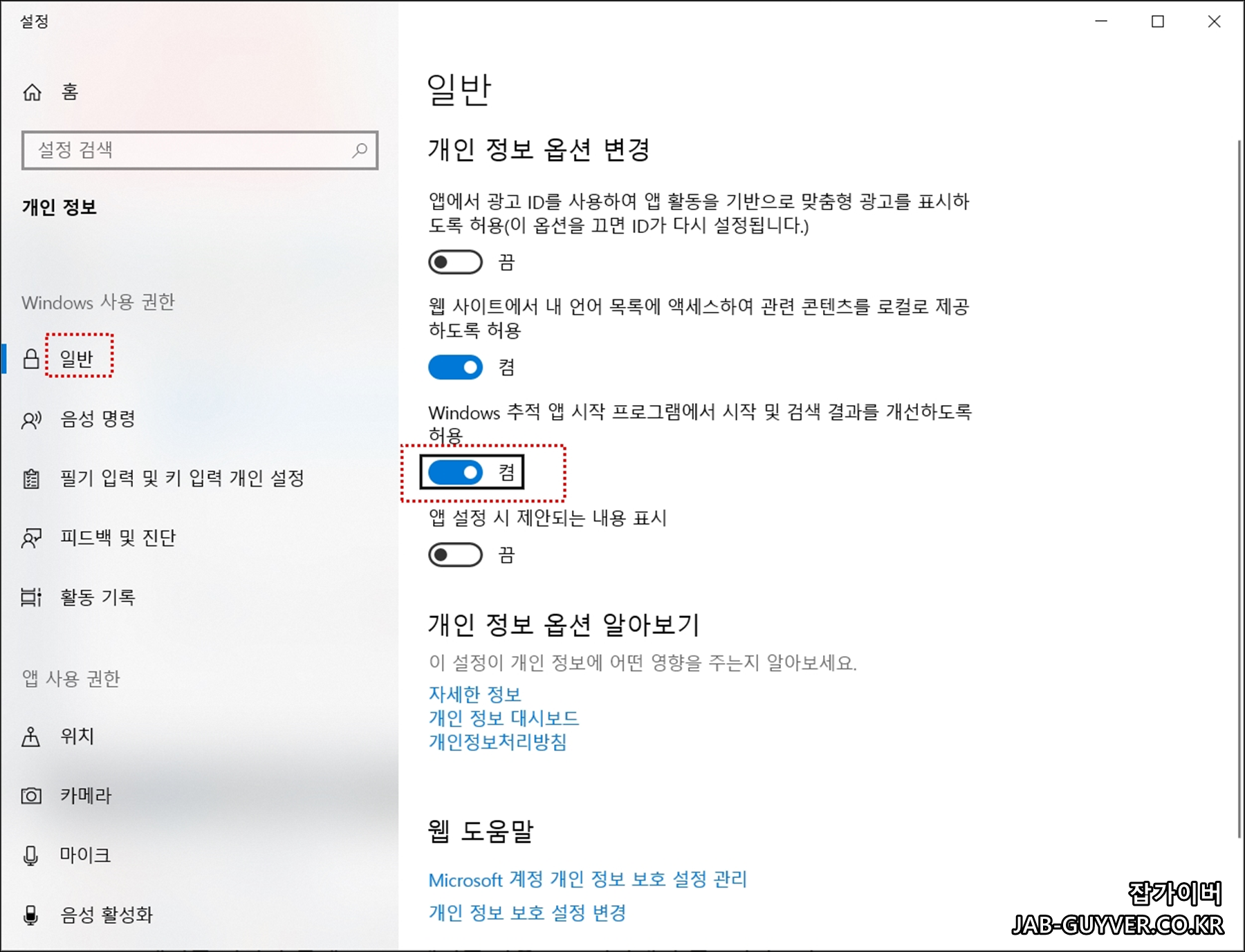 윈도우 설정으로 들어가면 윈도우 추적을 통해 검색결과를 개선하는 정보를 마이크로소프트로부터 전송하게 되느데 이럴때마다 컴퓨터 느려지는 원인이 될 수 있기 때문에 비활성화합니다.