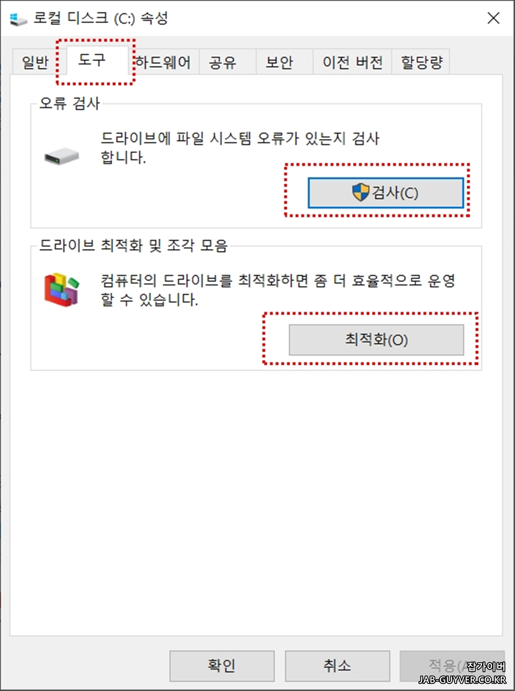 마지막으로 도구탭으로 이동해서 디스크검사를 통해 배드섹터나 오류파일등을 찾아 치료하고 디스크 조각모음을 통해 드라이브 최적화를 하면 컴퓨터 속도가 효율적으로 빨라집니다.