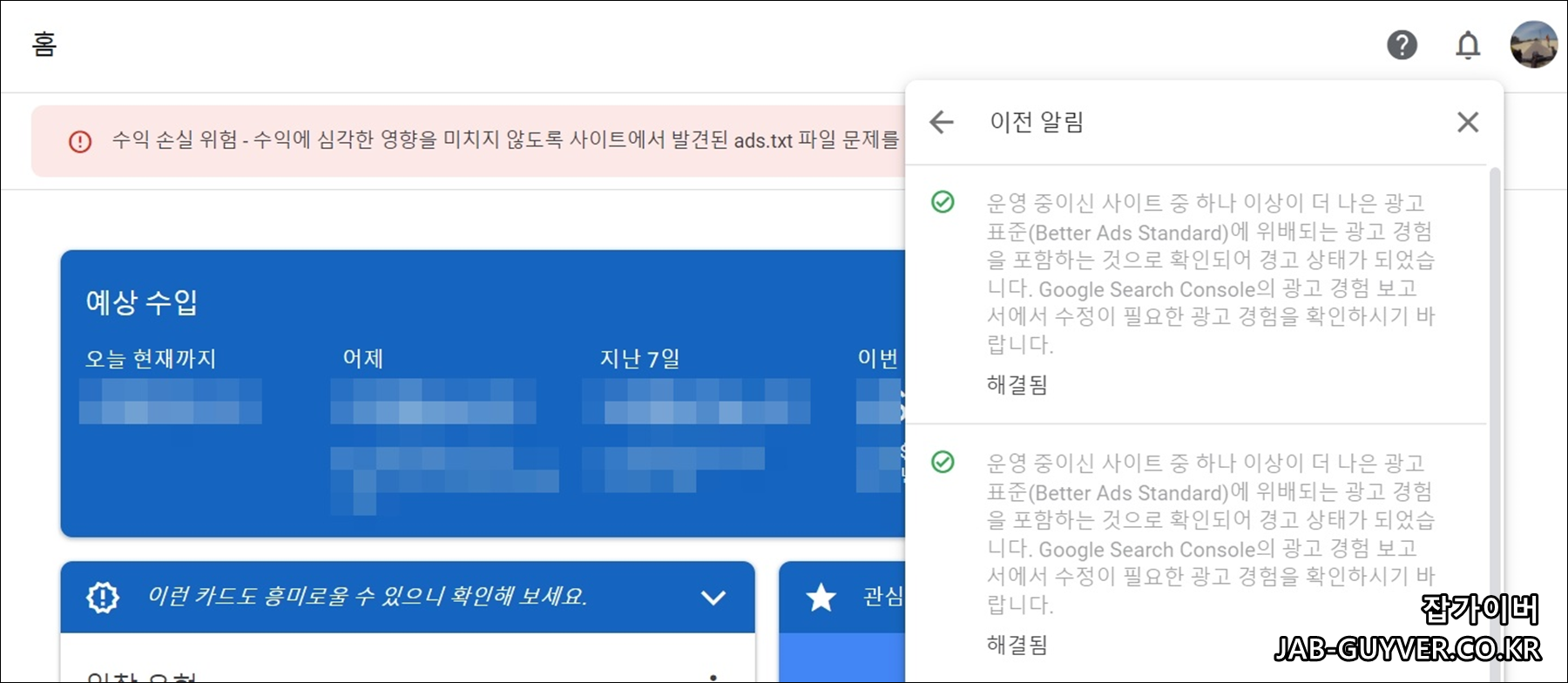 구글애드센스 접속 하면 알림창에 보느것과 같이 알림이 표시됩니다.