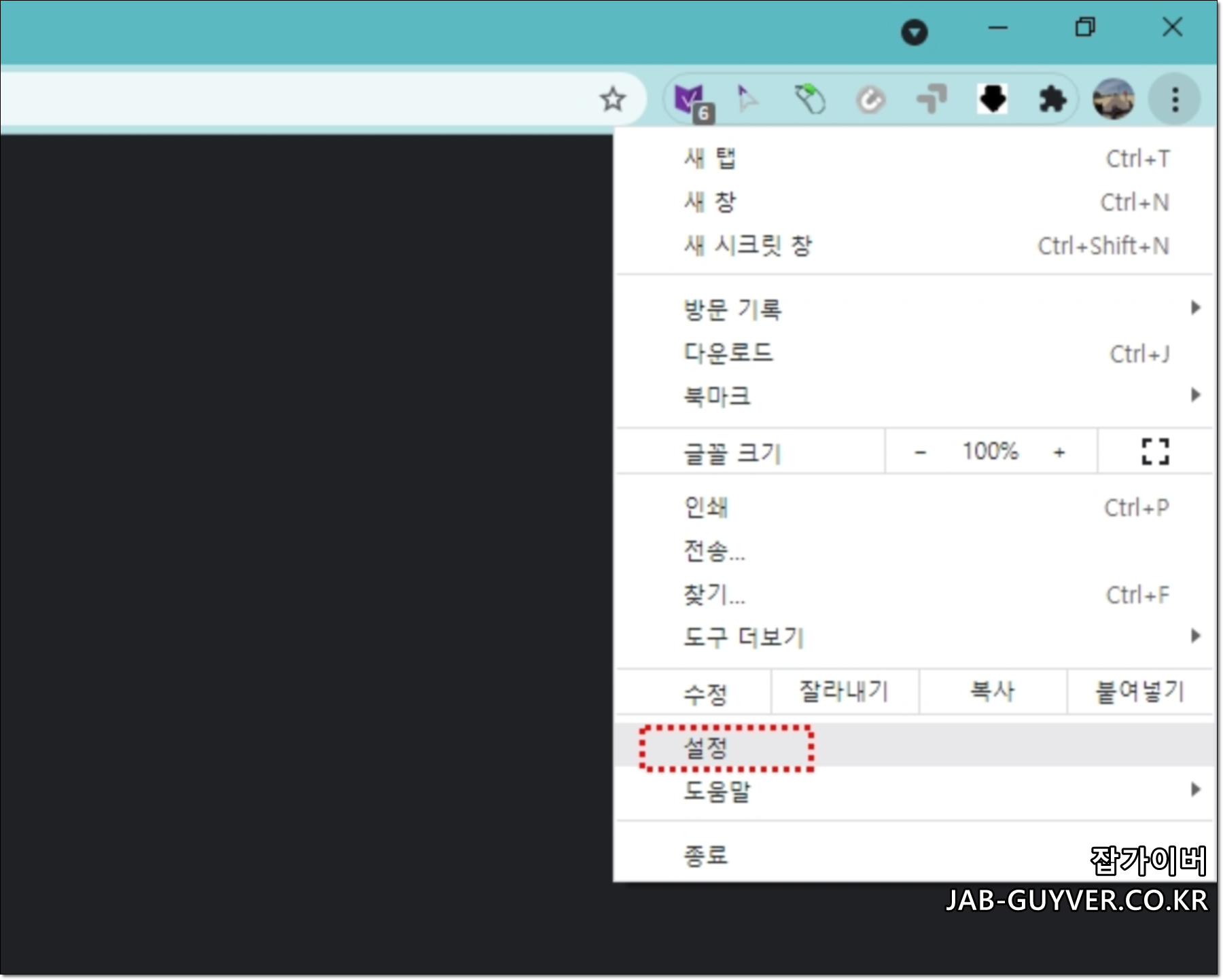우선 구글크롬을 실행 후 설정으로 들어갑니다.