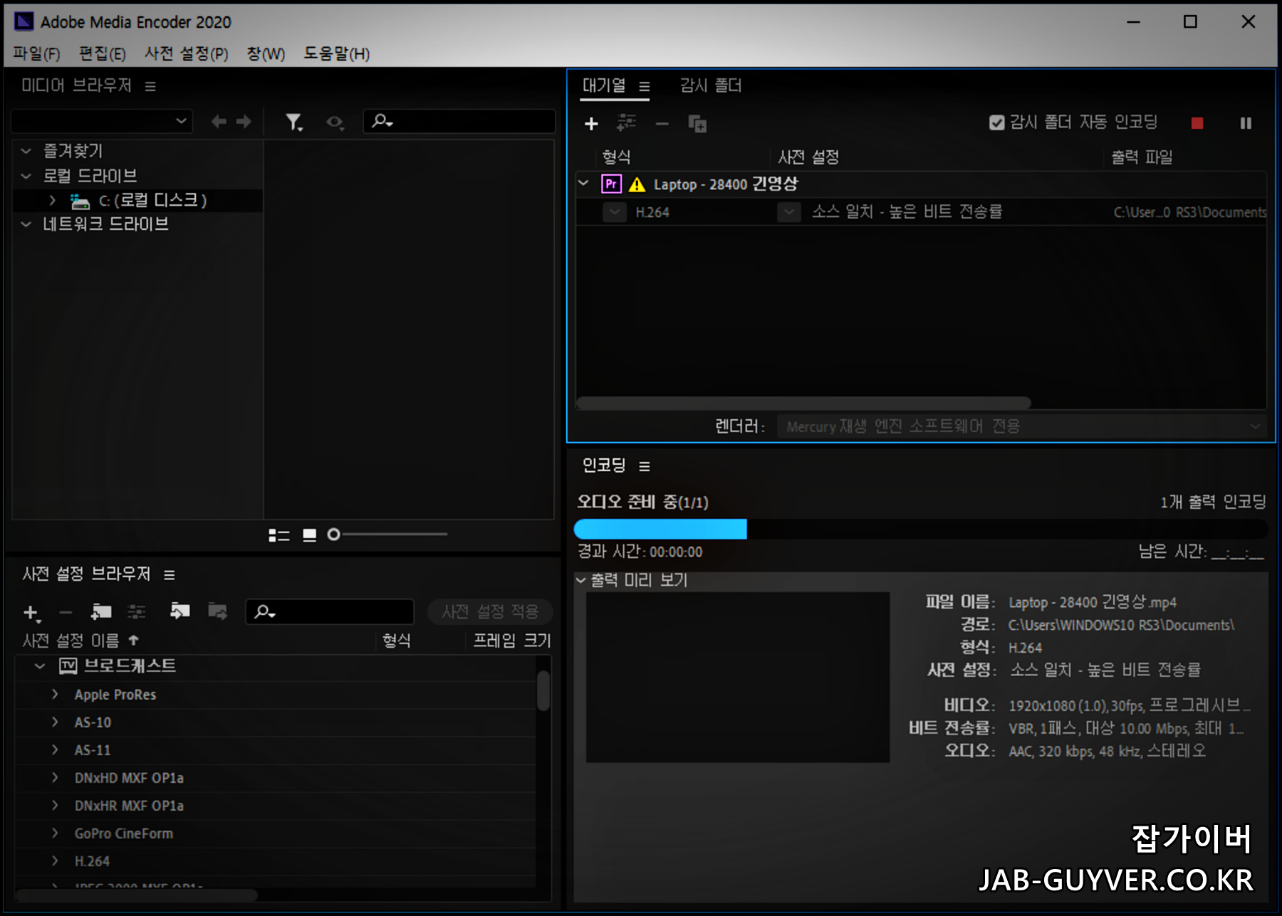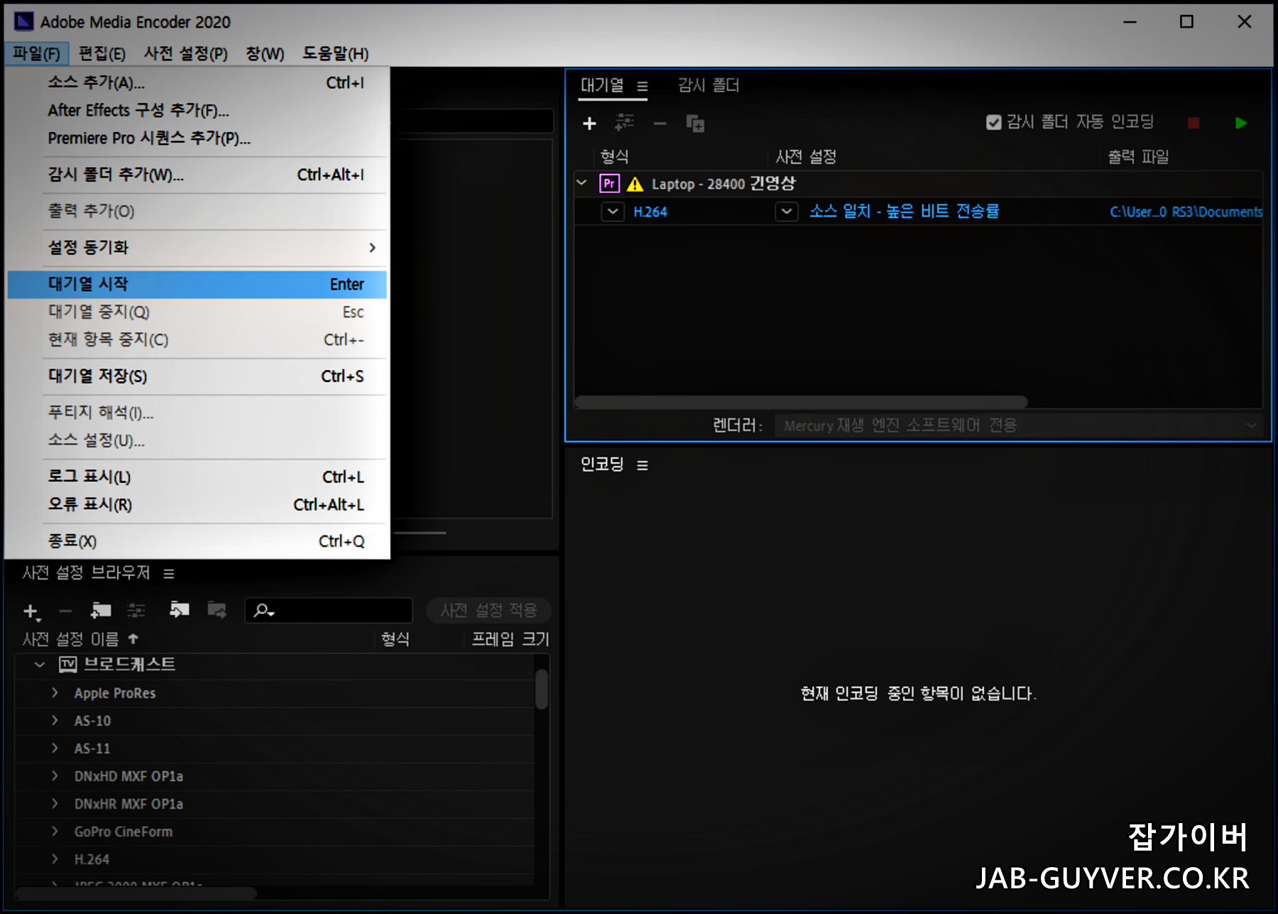 Adobe에서 제공하는 미디어인코더를 사용하면 프리미어, 에프터이펙트, 오디션,애니메이터등 등으로 작업한 프로젝트 파일을 가지고와서 동영상 인코딩이 가능합니다. 이는 각각의 영상 편집 및 오디오 편집 프로그램에서 실행할 수 있지만 미디어인코더를 설치하면 단독으로 실행해서 프로젝트 파일을 열어 인코딩할 수 있습니다.