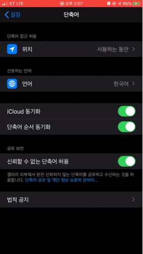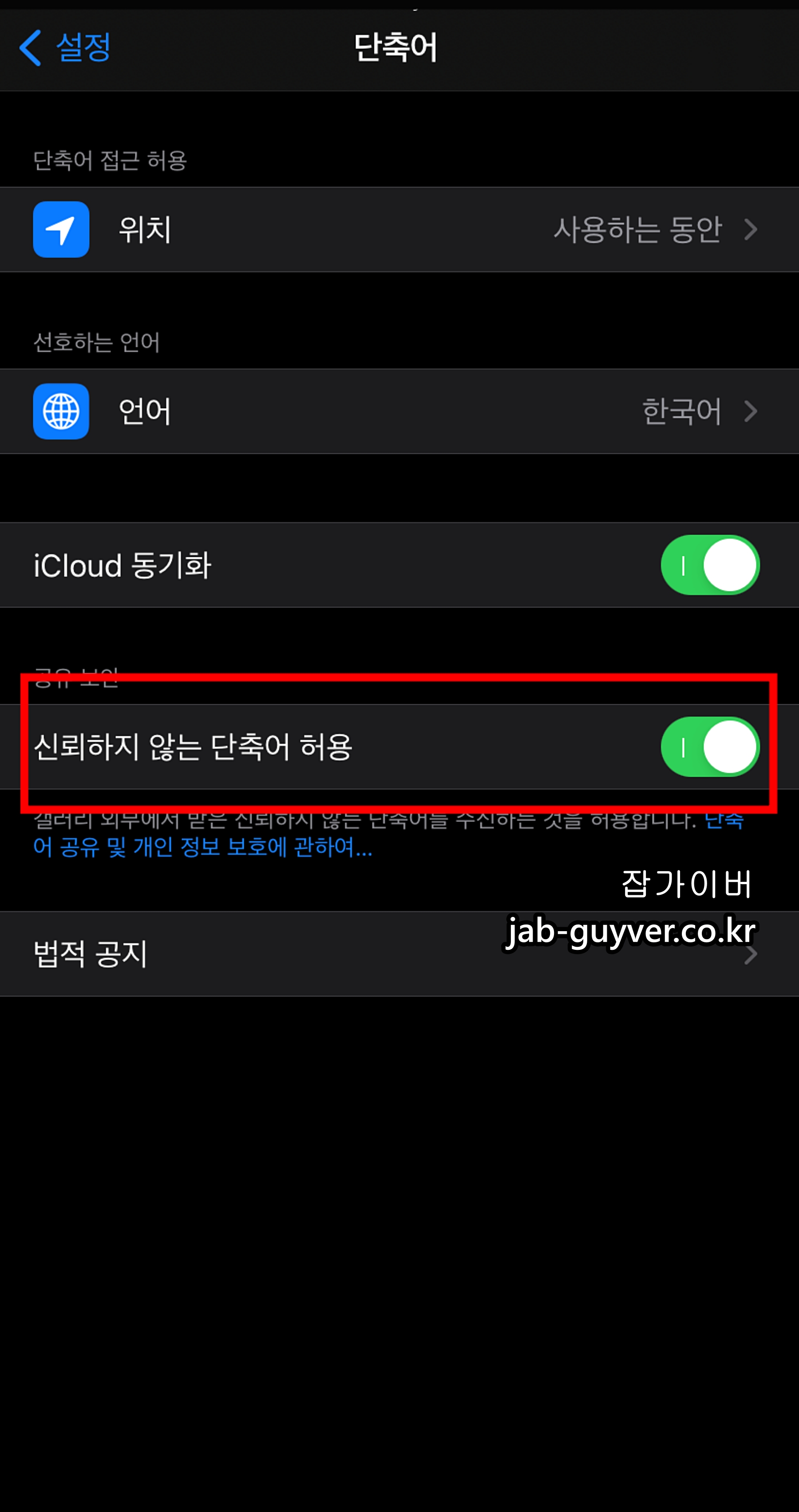 - 설정 > 단축어 > 신뢰하지 않는 단축어 허용 활성화