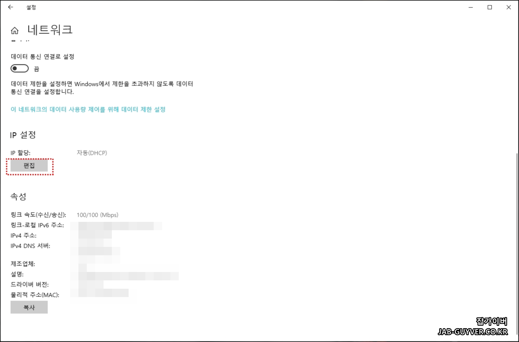 윈도우10 고정 IP주소 및 DNS 주소변경