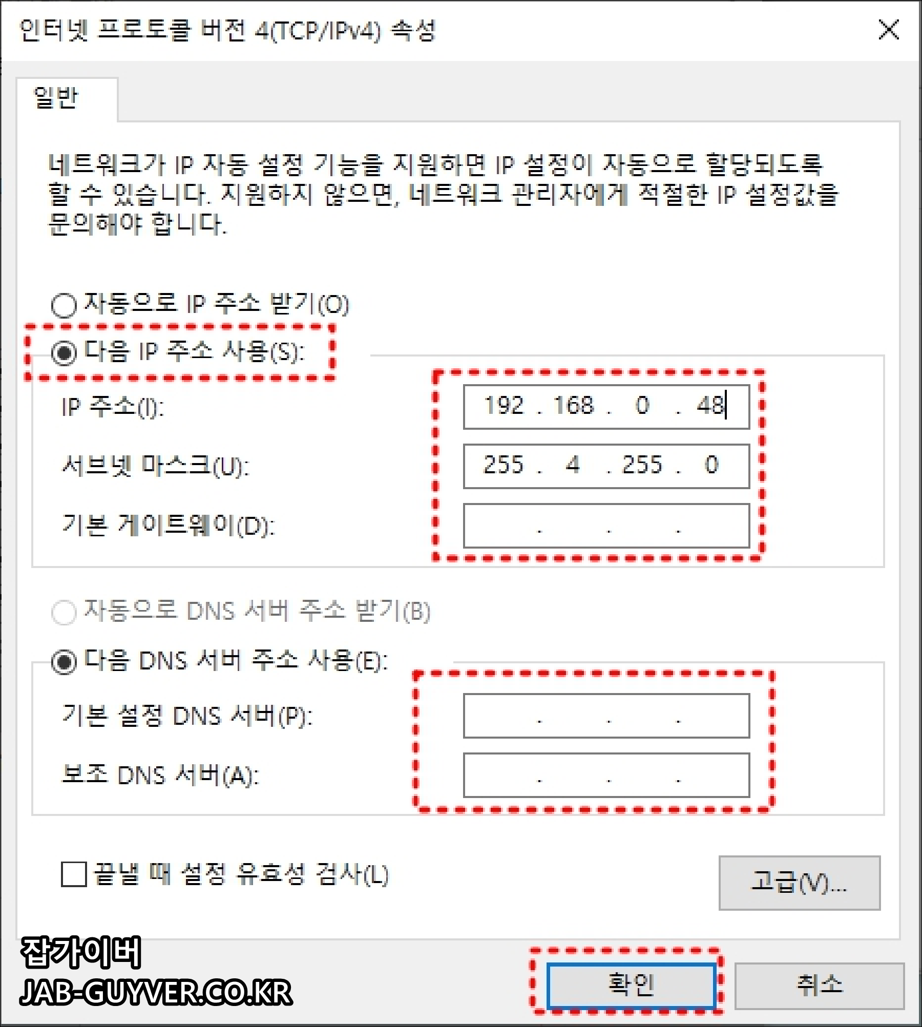 - 원하는 ip주소를 입력해서 고정ip주소로 변경하고 자동DNS 주소에서 수동 DNS주소로 변경합니다.
