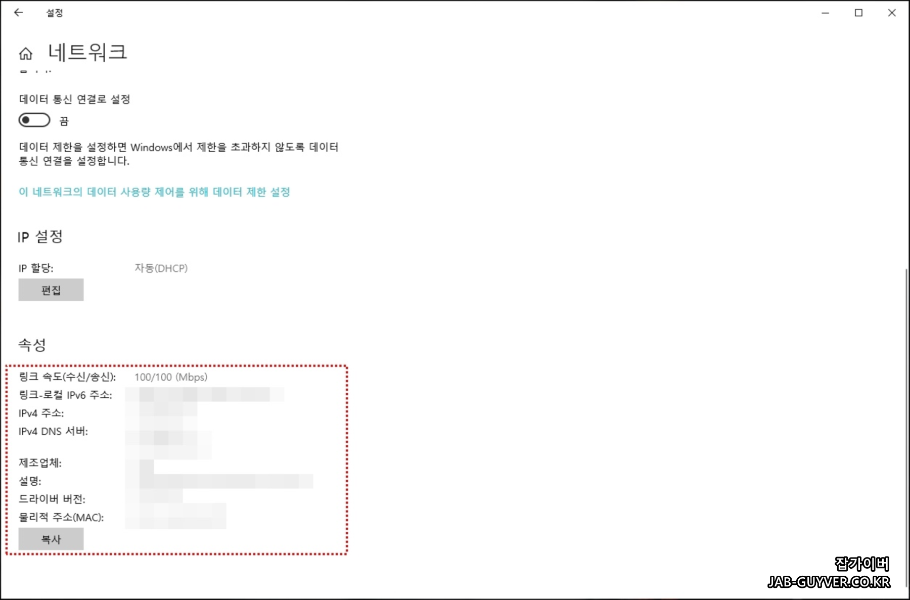 그 외에도 인터넷 랜카드 제조업체 및 드라이브 버전, 물리적 주소 "Mac Address"를 확인할 수 있습니다.