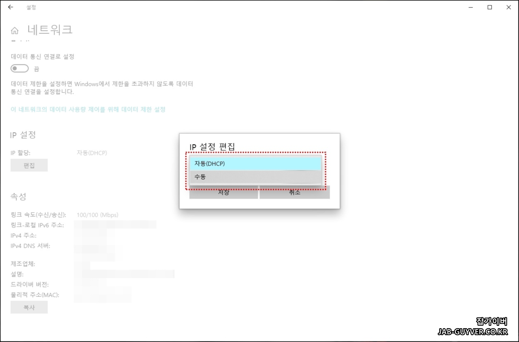 기본적으로 윈도우에서는 IP설정이 자동"DHCP"로 되어 있으며 수동으로 변경합니다.