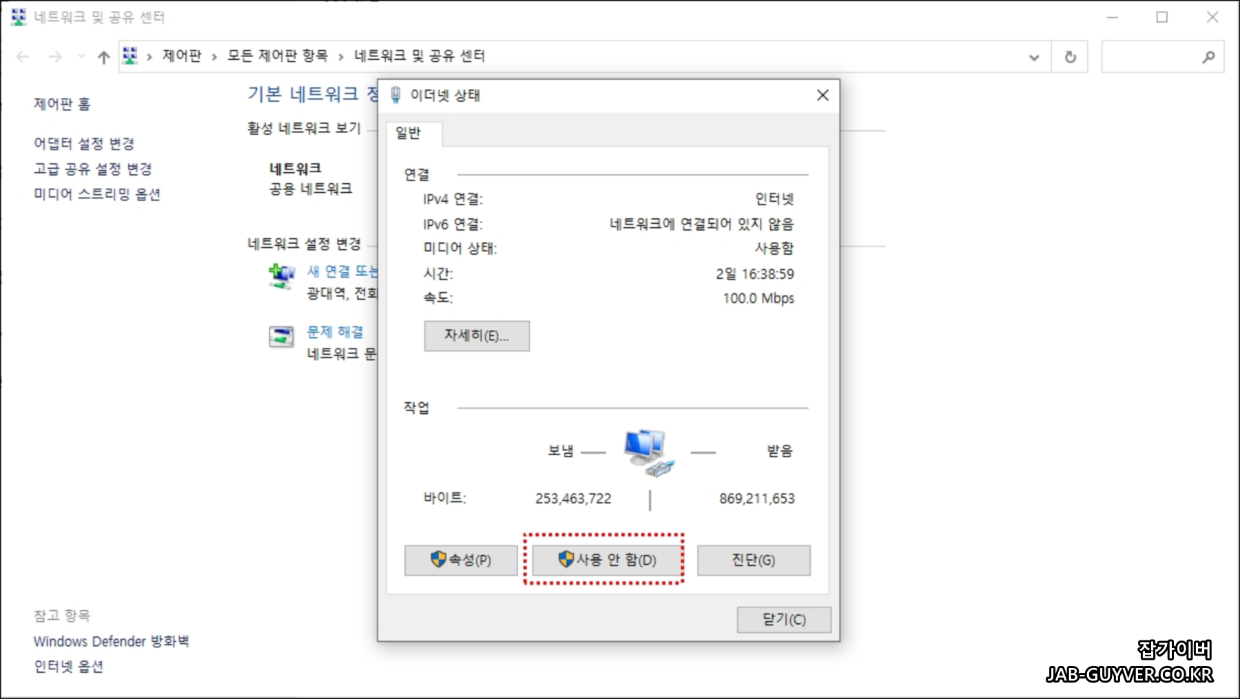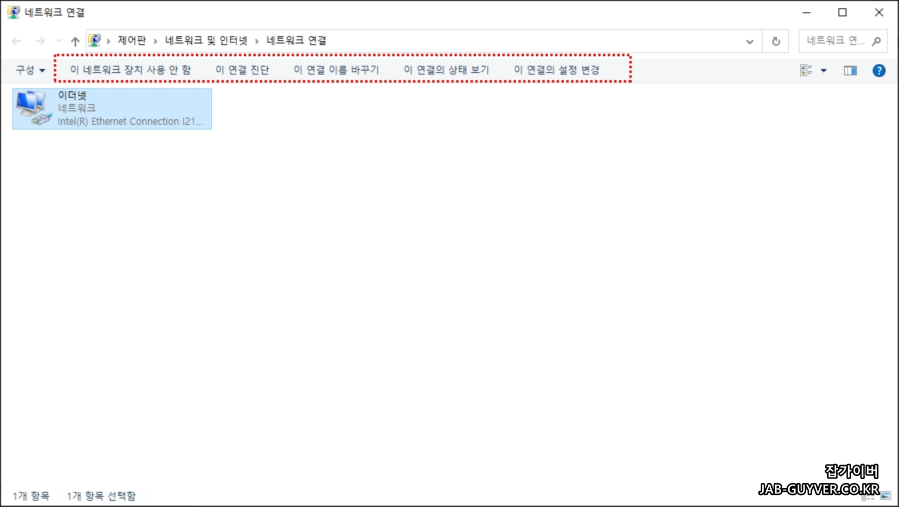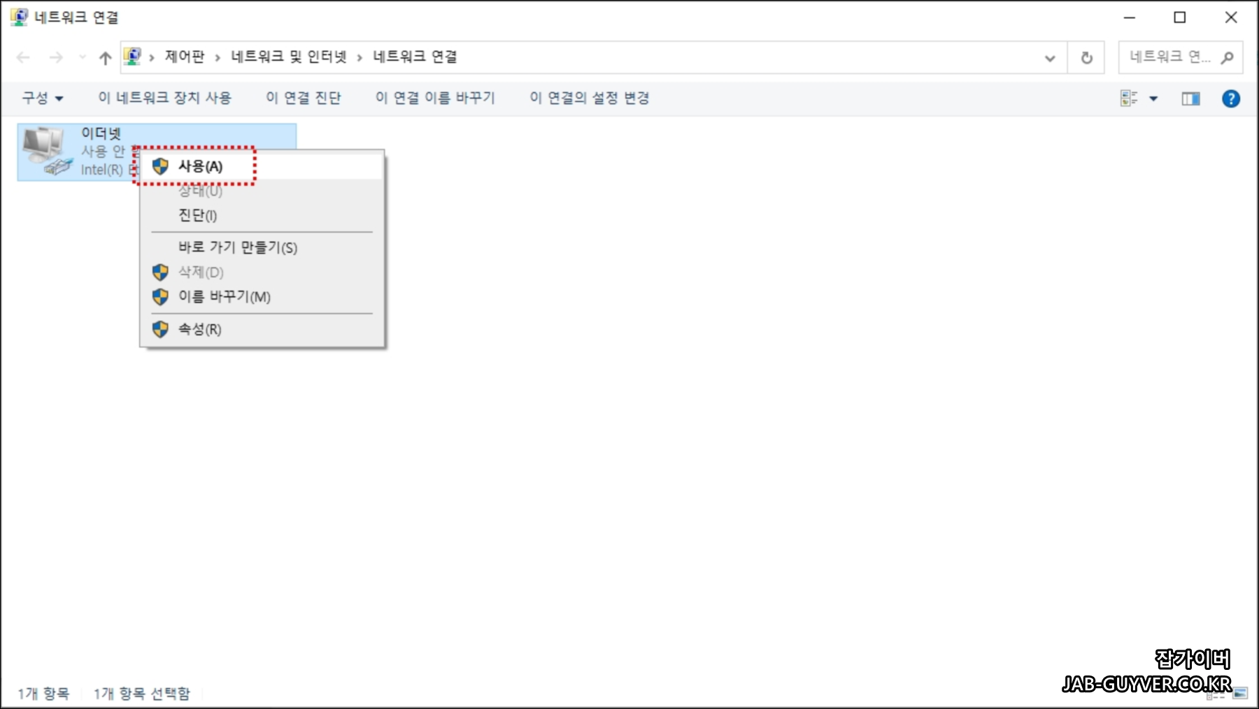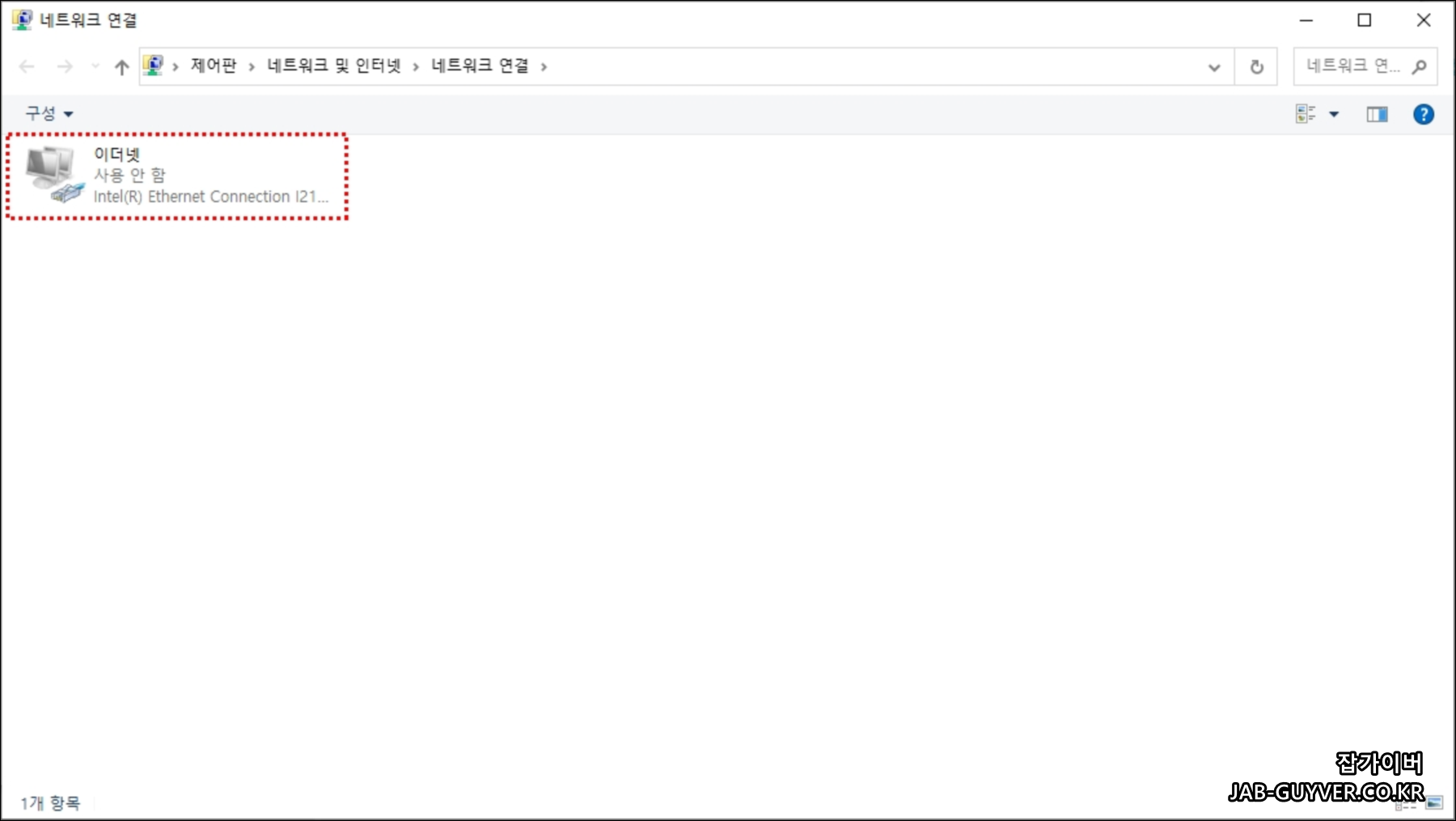 현재 이더넷 연결이 사용안함으로 네트워크 연결이 끊긴것을 볼 수 있습니다.