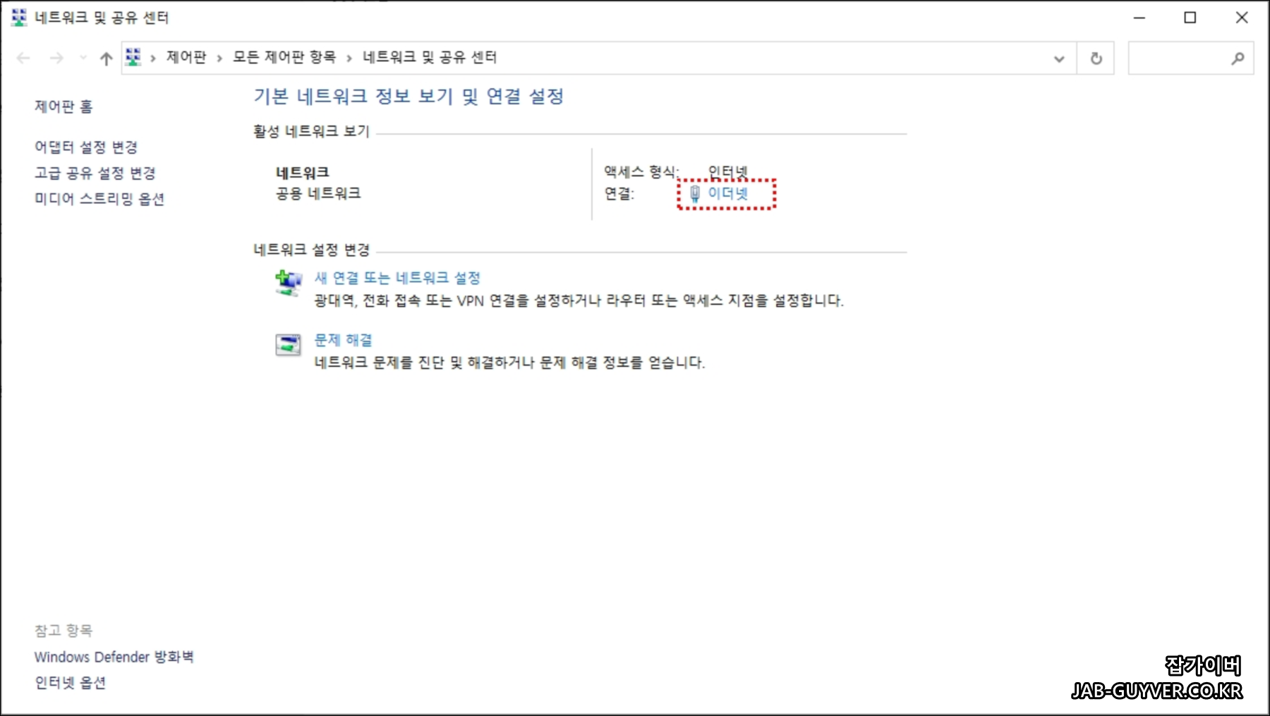 현재 네트워크 및 인터넷 상태에서 고급네트워크 -> 네트워크 및 공유센터를 선택합니다.