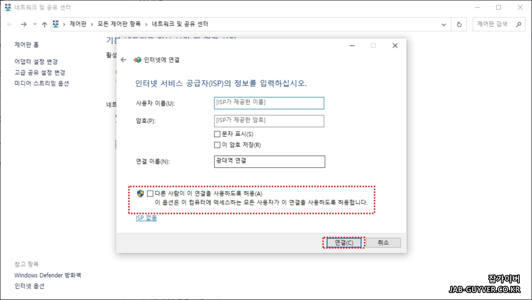 이를 통해 광대역 전화 접속 또는 VPN 연결을 설정하거나 라우터에 연결을 설정할 수 있습니다.