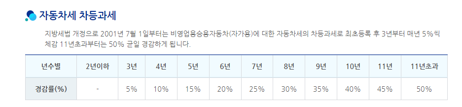또한, 승용차는 최초 등록 이후 만 2년이 초과되면 그 이후 세액이 감면되며 1년당 5%씩 자동차세가 감면되며 최대 50%까지 감면되기 때문에  오래된 자동차일수록 자동차세 절세할 수 있습니다.