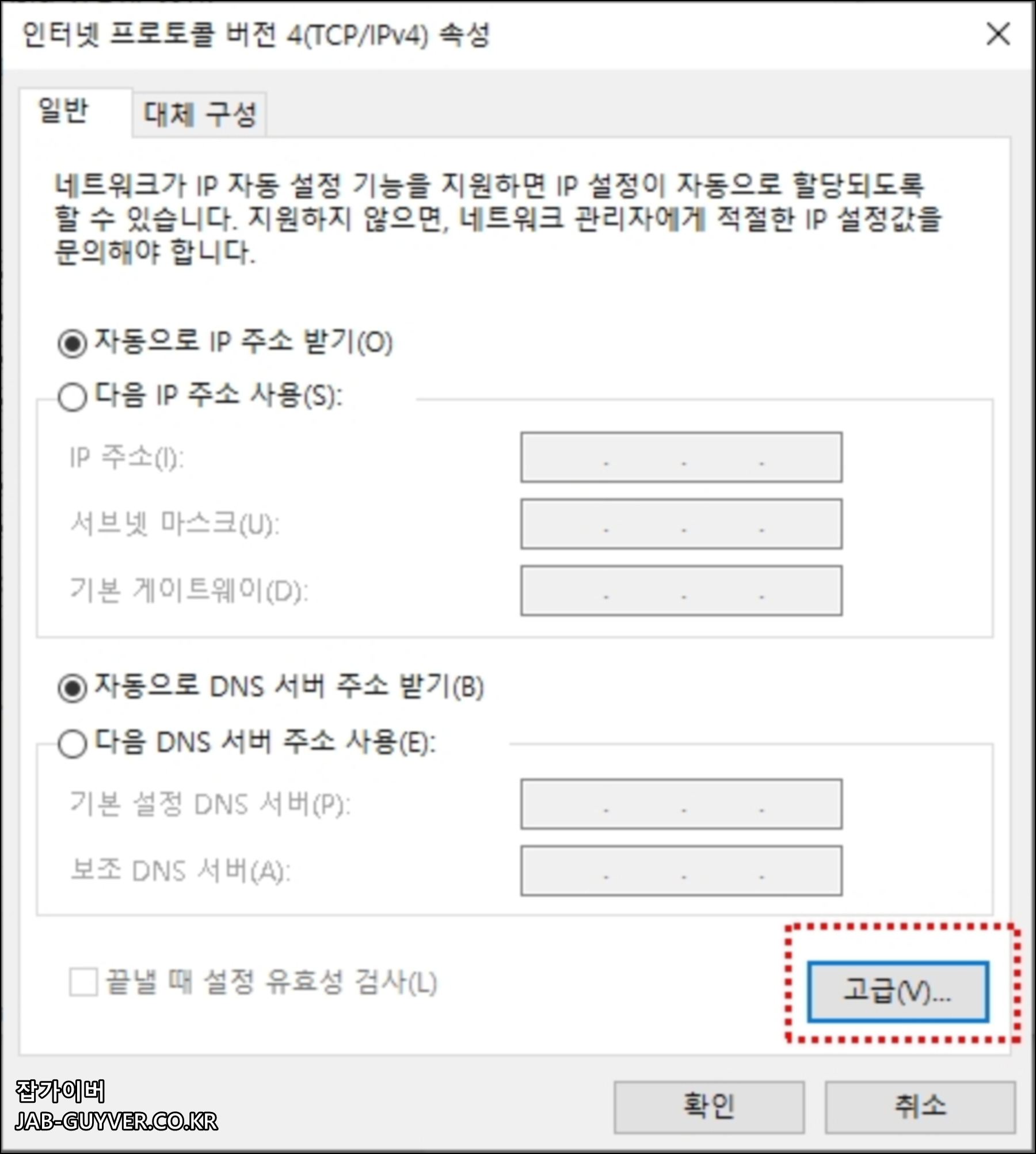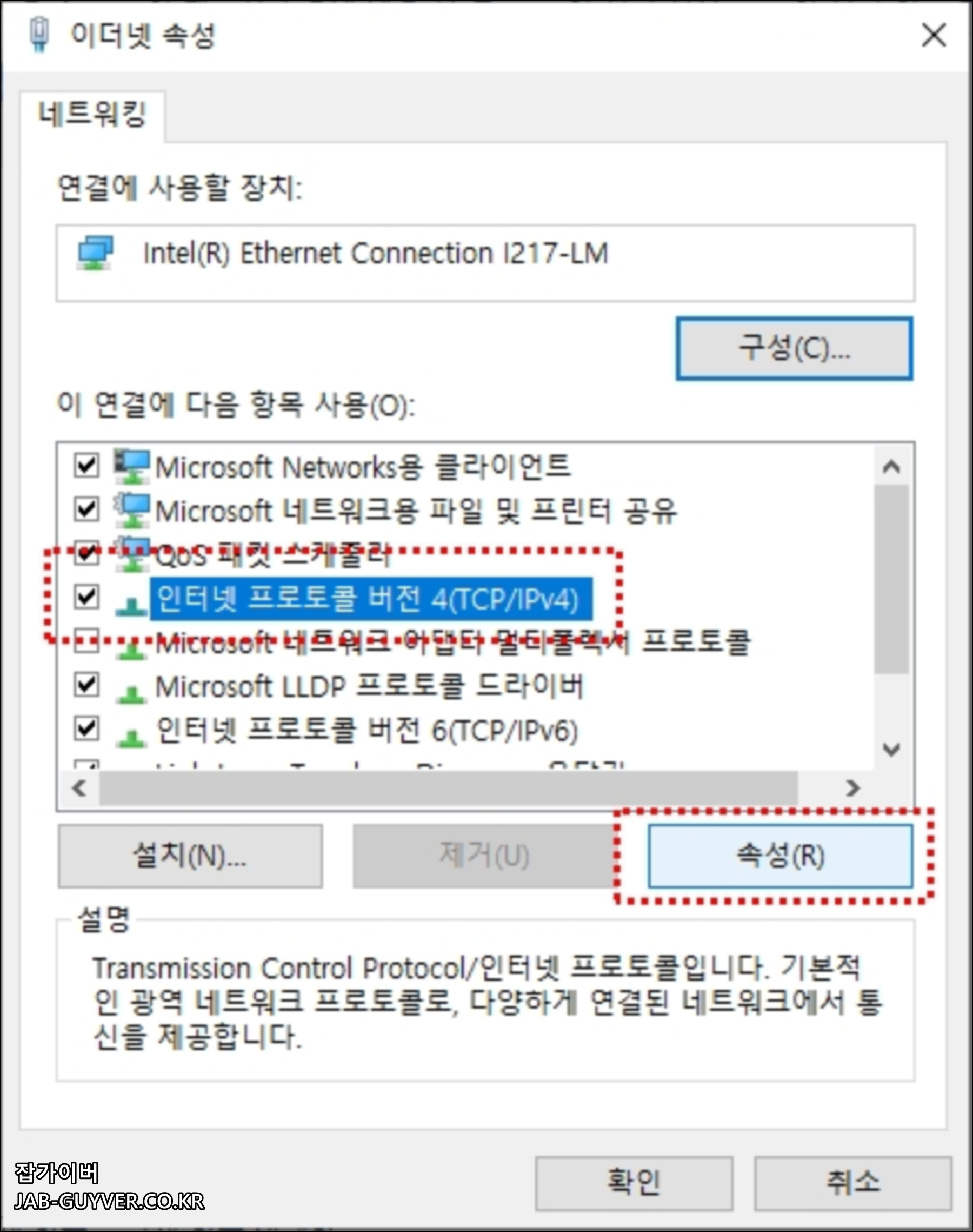 인터넷 프로토콜 버전 4(TCP/IPv4) 속성으로 들어갑니다.