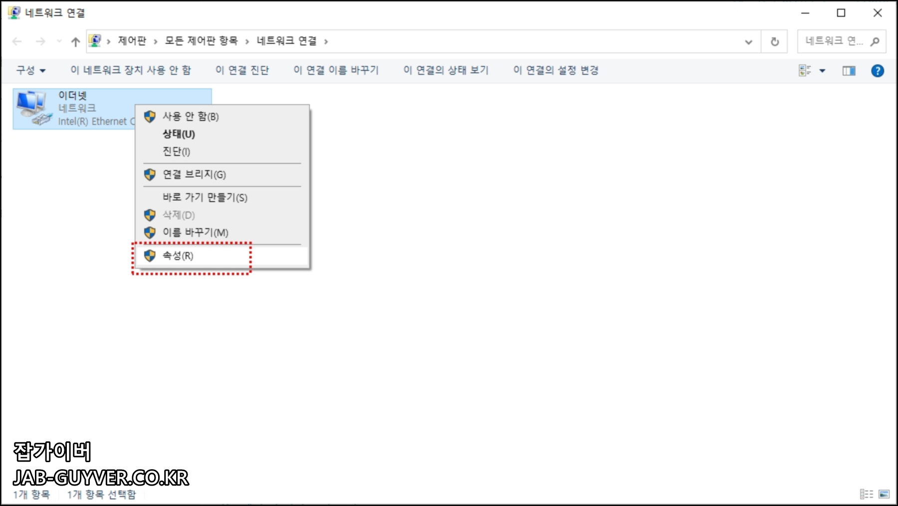 네트워크 연결에서 이더넷 창을 실행합니다.