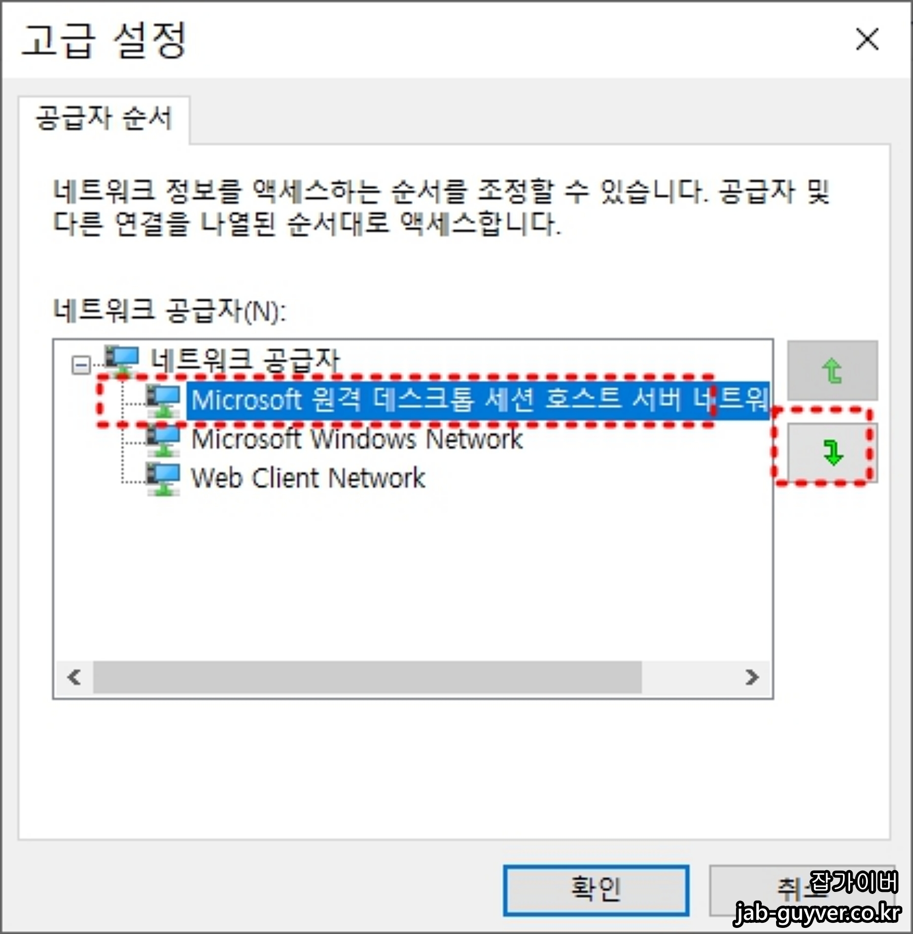 현재 저는 마이크로소프트 원격 데스트콥 세션 호스트 서버, 마이크로소프트 윈도우 네트워크, 웹 클라이언트 네트워크가 있으며 이 중에서 가장 먼저 사용할 네트워크를 좌측 화살표를 통해 위아래 눌러 우선순위 순서를 변경해줍니다.