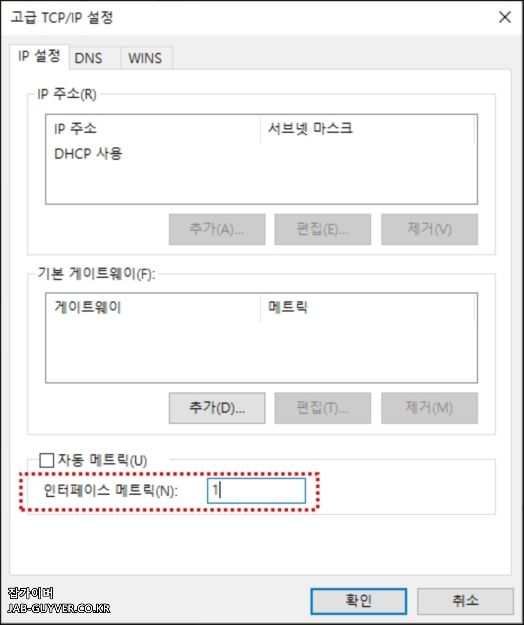체크해재 후 인터페이스 메트릭에 우선 연결하고자 하는 순위를 입력합니다.