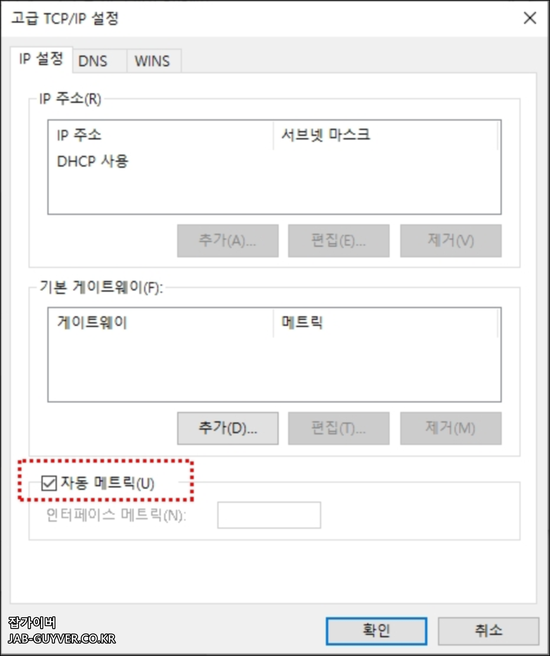 하단의 자동메트릭이 체크되어 있으면 컴퓨터 부팅시 랜카드 연결을 자동으로 연결됩니다.