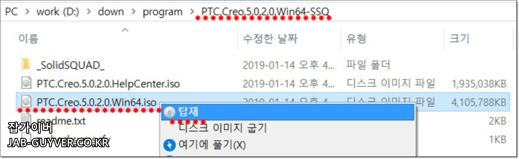 PTC.Creo 5.0.2.0 Wind64.iso 파일을 마우스 우클릭 탑재를 눌러줍니다.