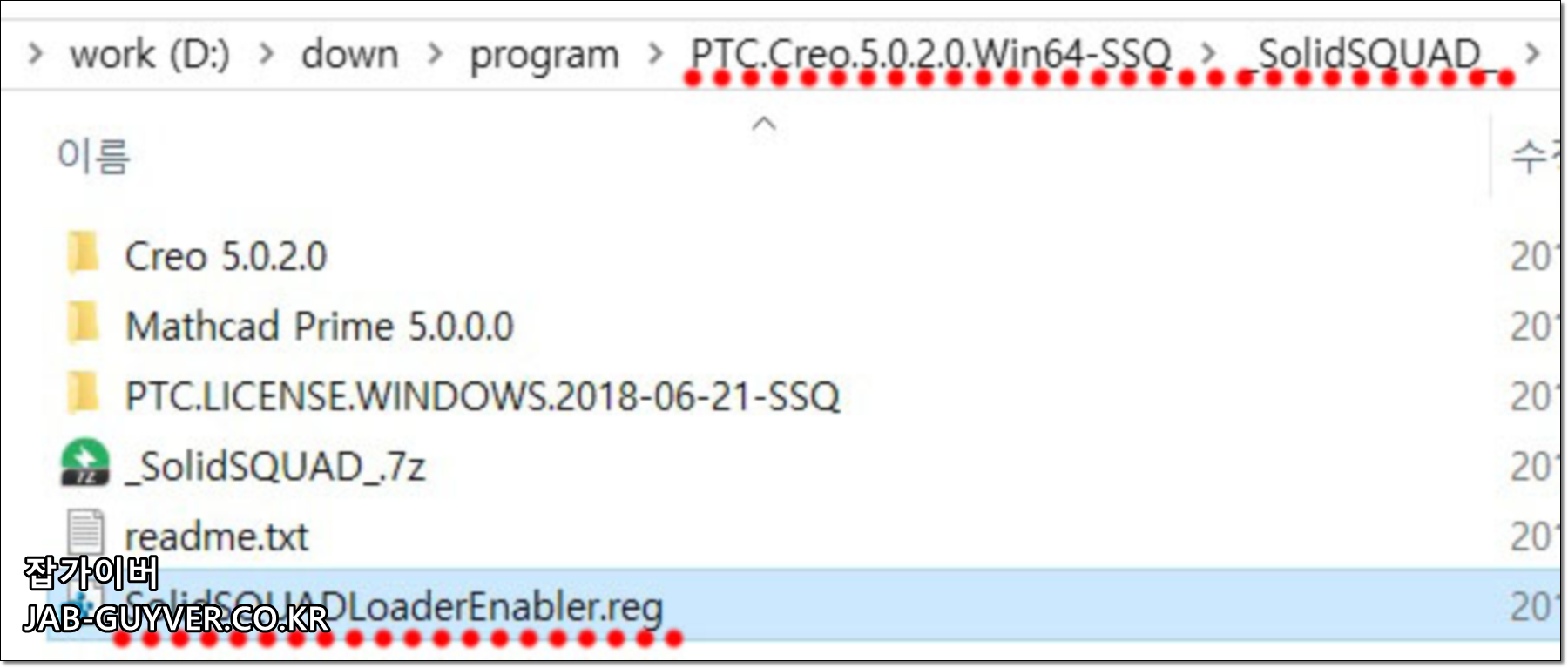PTC Creo 5.0.2.0 SSQ -> SolidSQUAD 폴더에 있는 Creo 5.0.2.0 폴더를 복사합니다.