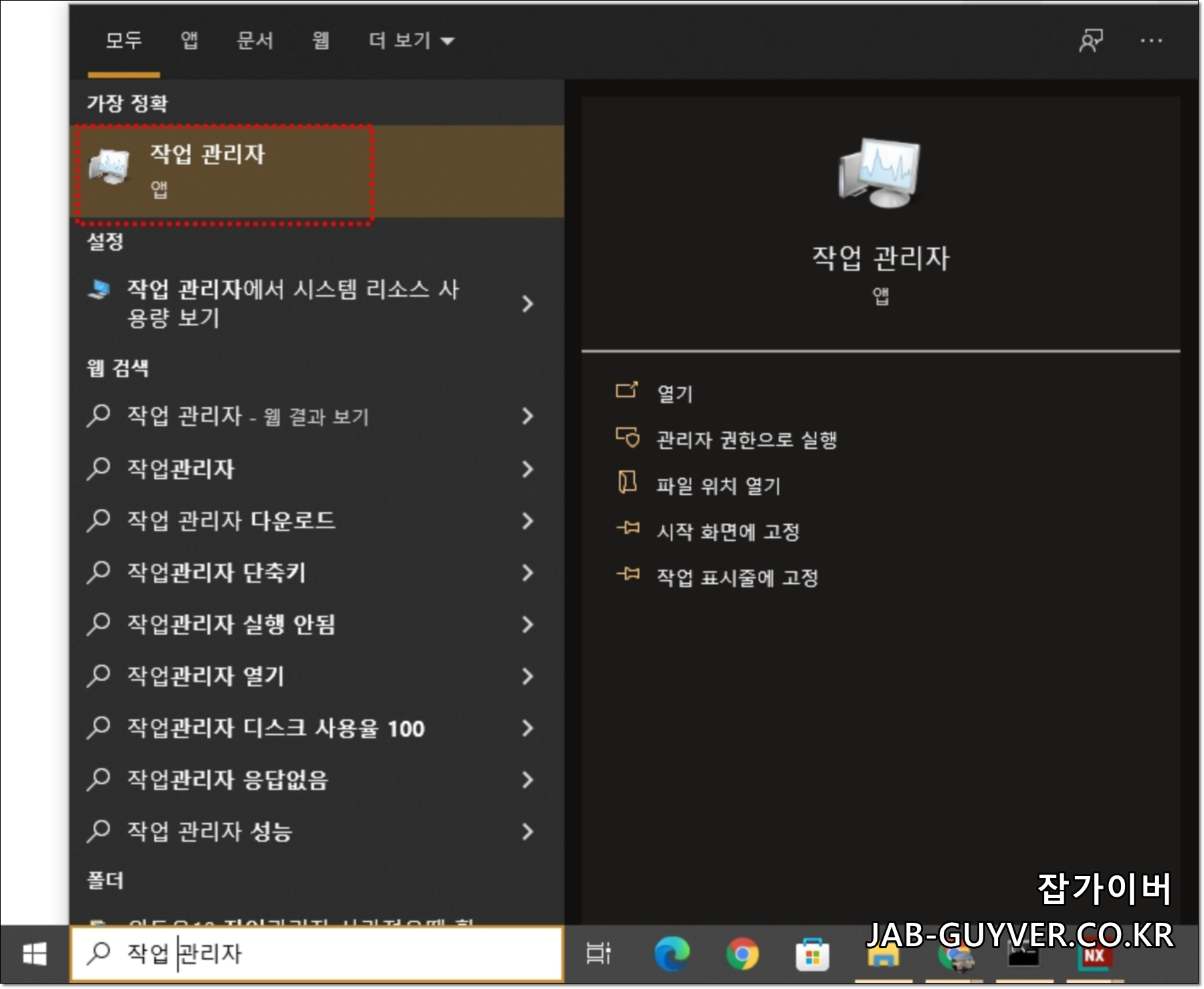 목록을 찾기 힘들다면 윈도우 검색창에 작업 관리자를 입력해서 바로 실행할 수 있습니다.