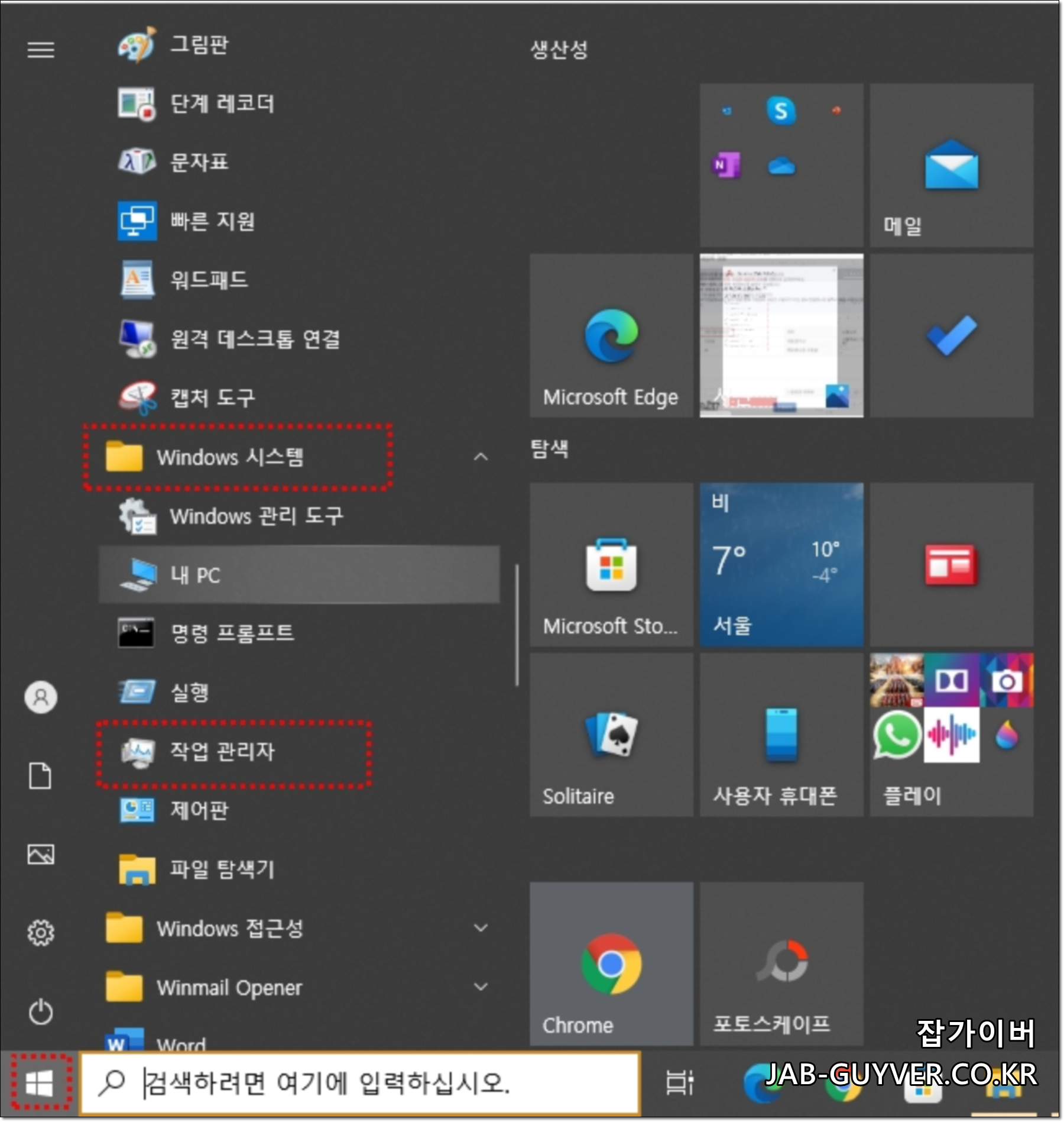 윈도우 검색창 작업관리자 수동 앱 실행방법