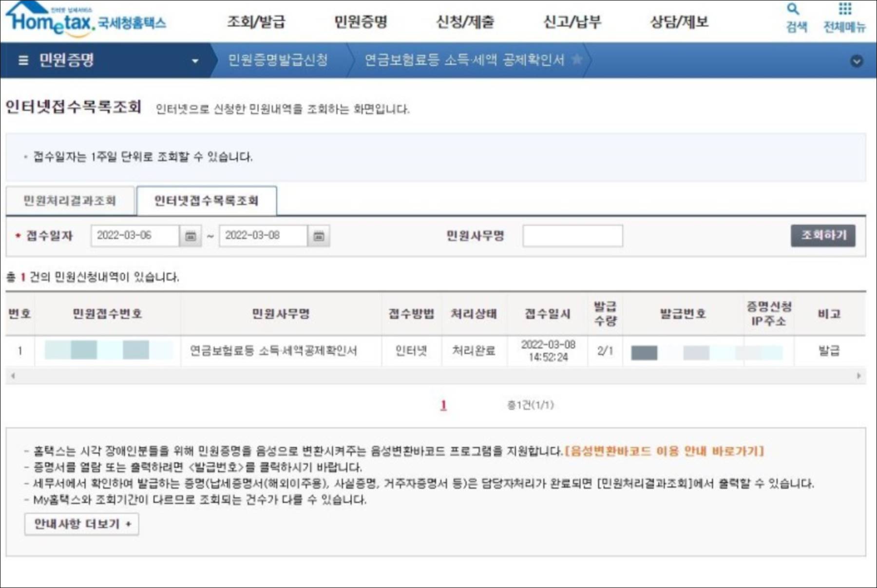 이를 통해 인터넷으로 연금보험료 소득 세액 공제확인서 발급이 완료됩니다.