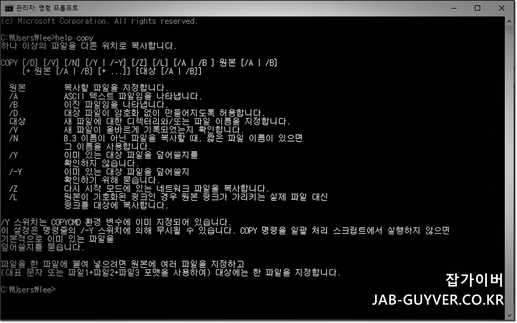 윈도우가 아닌 MS DOS 상태나 CMS, 명령프롬프트, 윈도우파워쉘등을 실행한 상태에서 파일이나 폴더를 복사하는 명령어입니다.