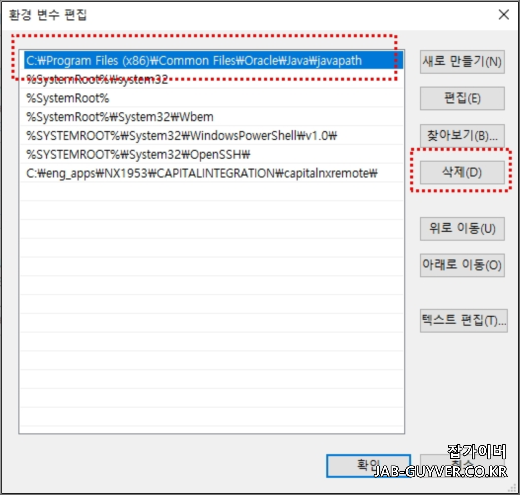 위 2개의 자바경로를 삭제하는것으로 자바 환경변수가 삭제가 완료되었습니다.
