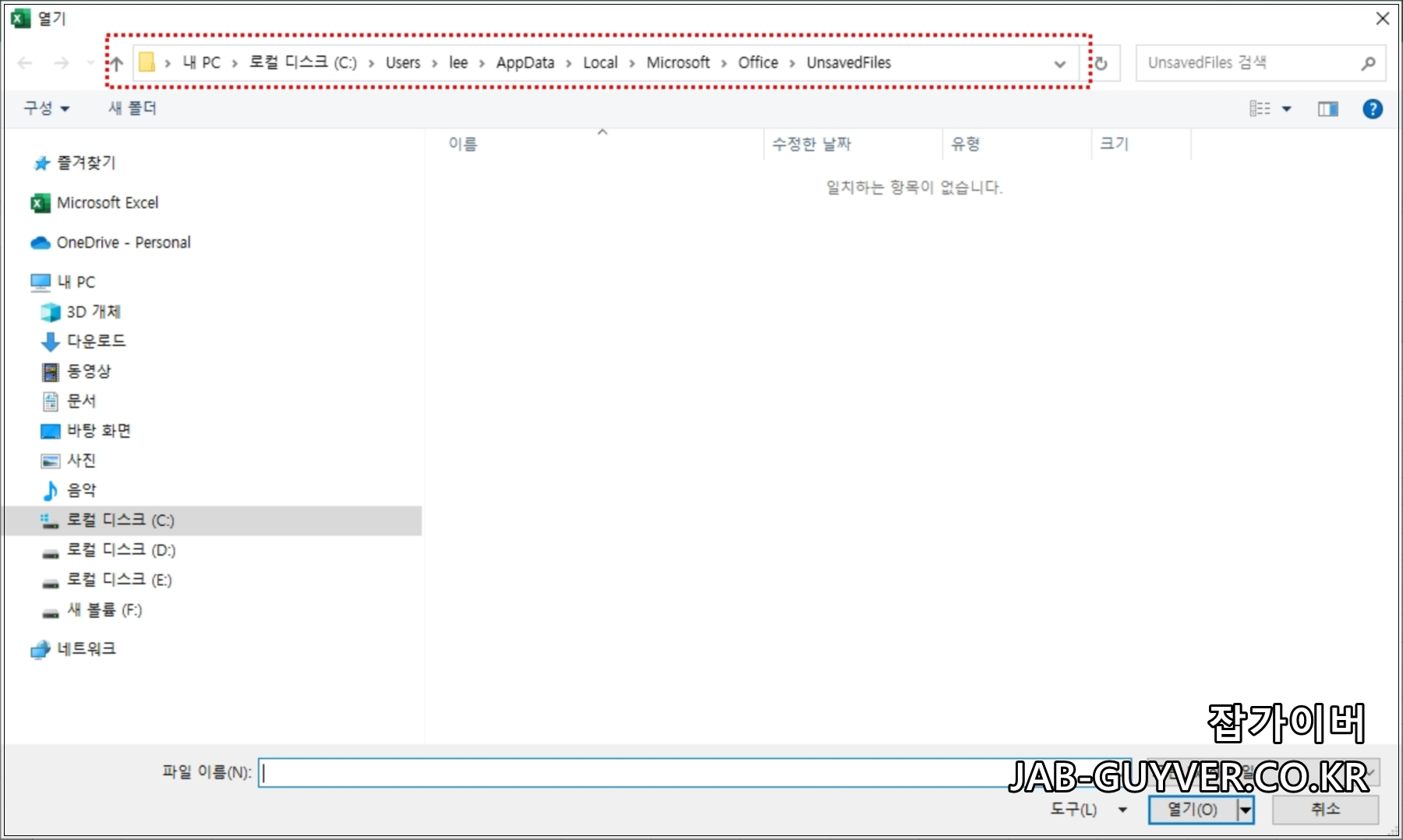 해당경로로 이동하면 저장하지 못하고 꺼진 엑셀파일이 임시파일로 저장된것을 볼 수 있습니다.