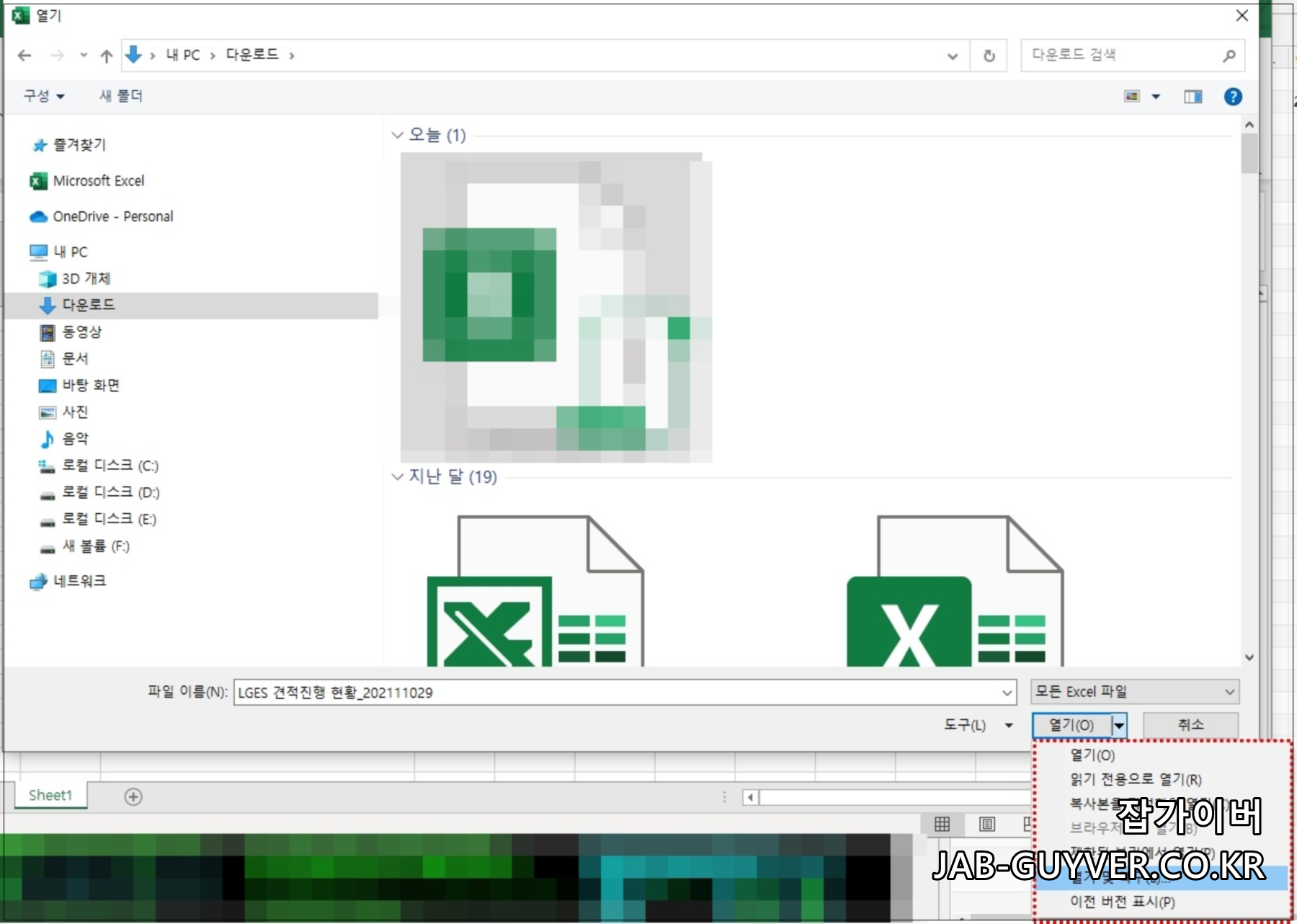 이후 엑셀파일을 열고자 할때 보느것과 같이 설정이 가능합니다.