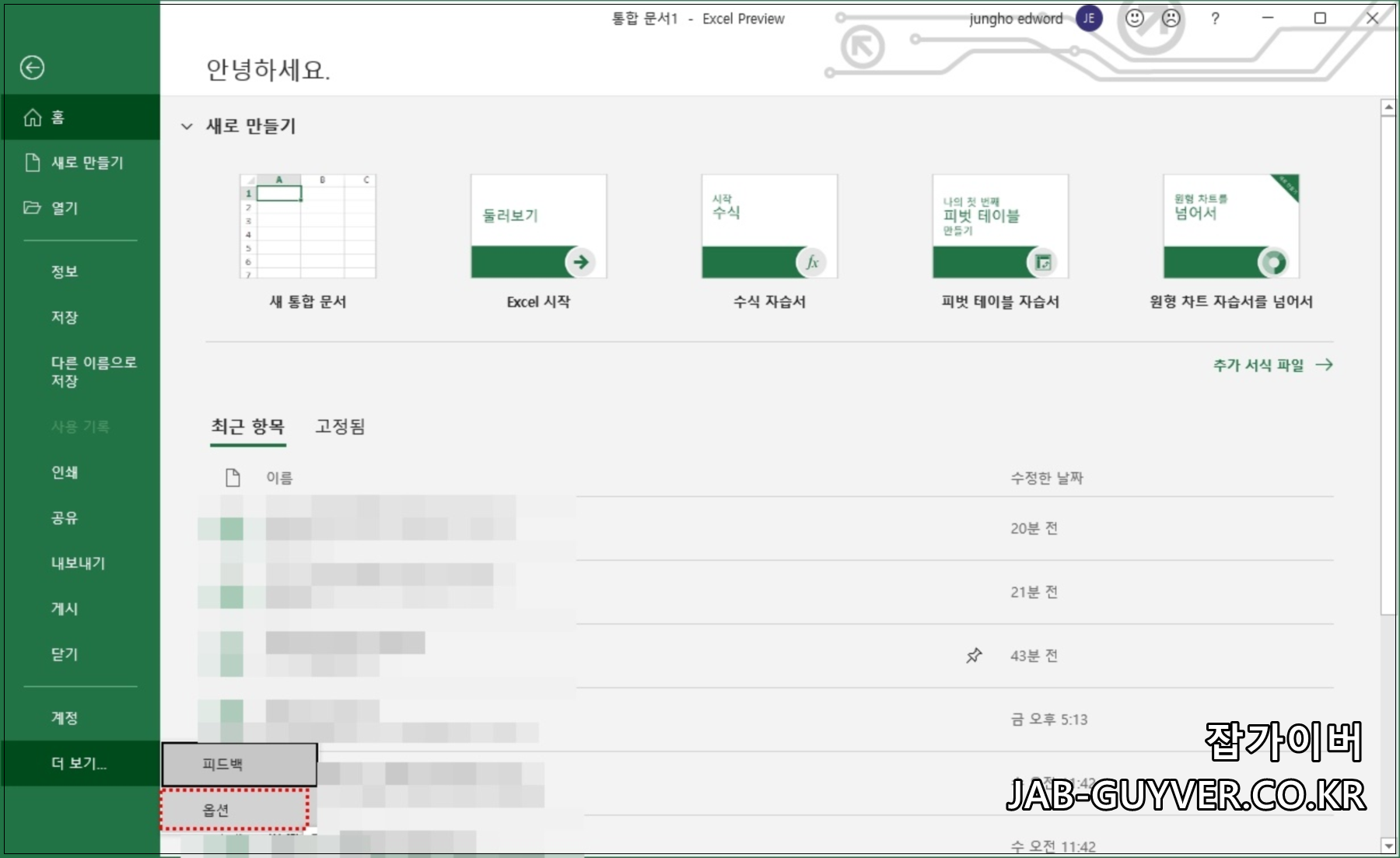 엑셀에서 옵션으로 들어갑니다.