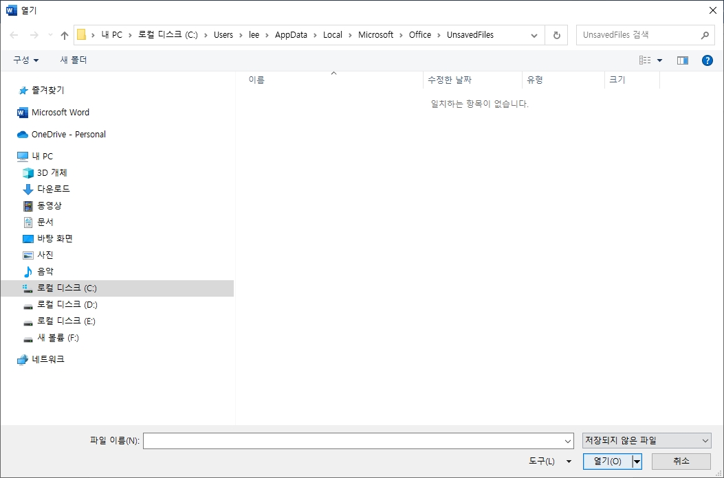 그럼 저장되지 않은 워드파일의 경로로 이동됩니다.