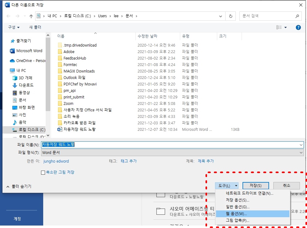그 외에도 기본 로컬파일 및 개인 서식파일은 C드라이브에 도큐먼트 폴더에 자동저장됩니다.