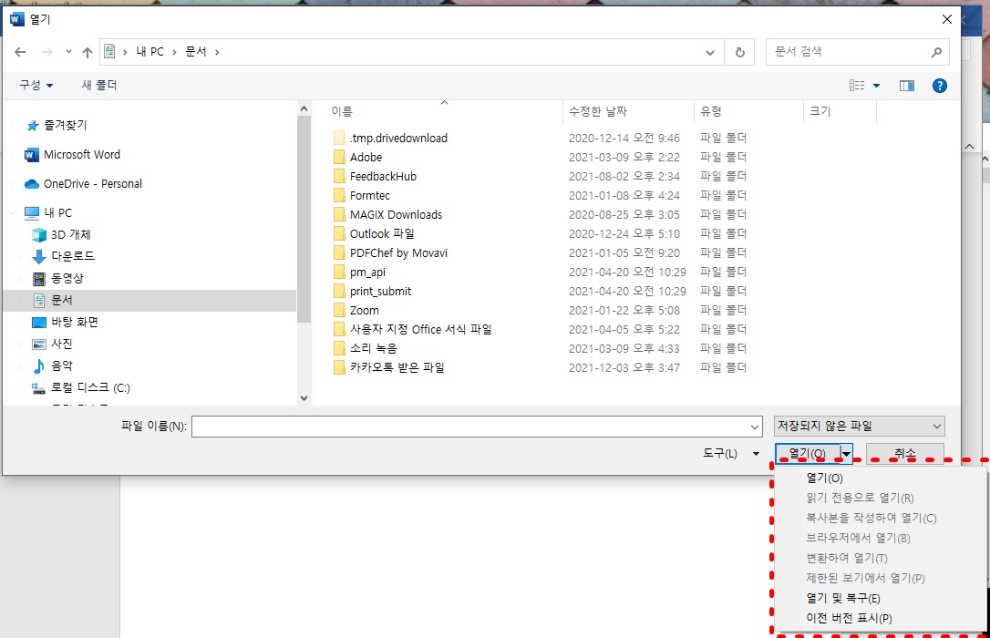 이때 파일을 일반열기 외에도 읽기전용, 복사본열기,열기 및 복구등이 가능합니다.