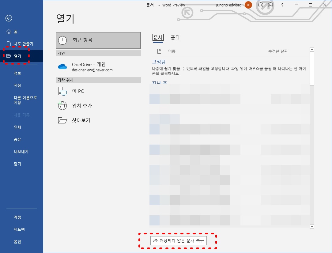 해당경로에서 저장하지 않은 워드파일을 엽니다.