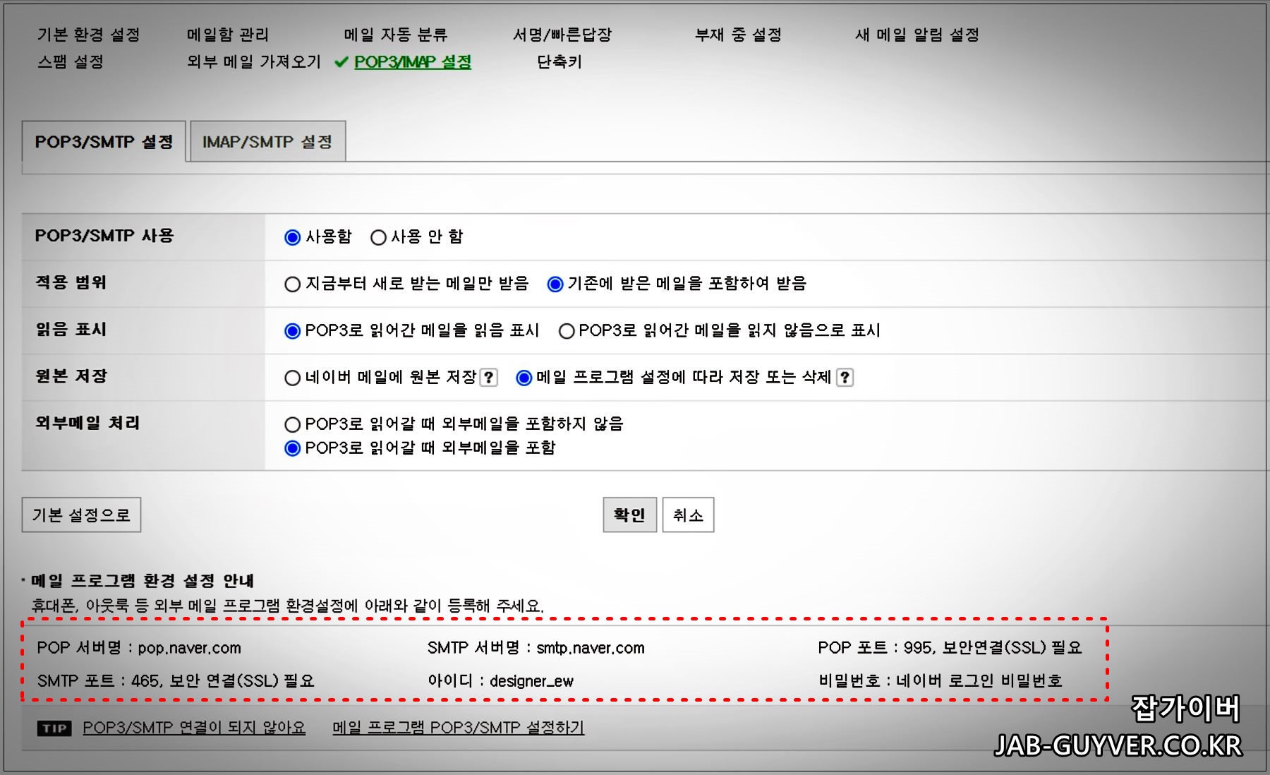 - POP 포트 : 995, 보안연결 (SSL) 필요