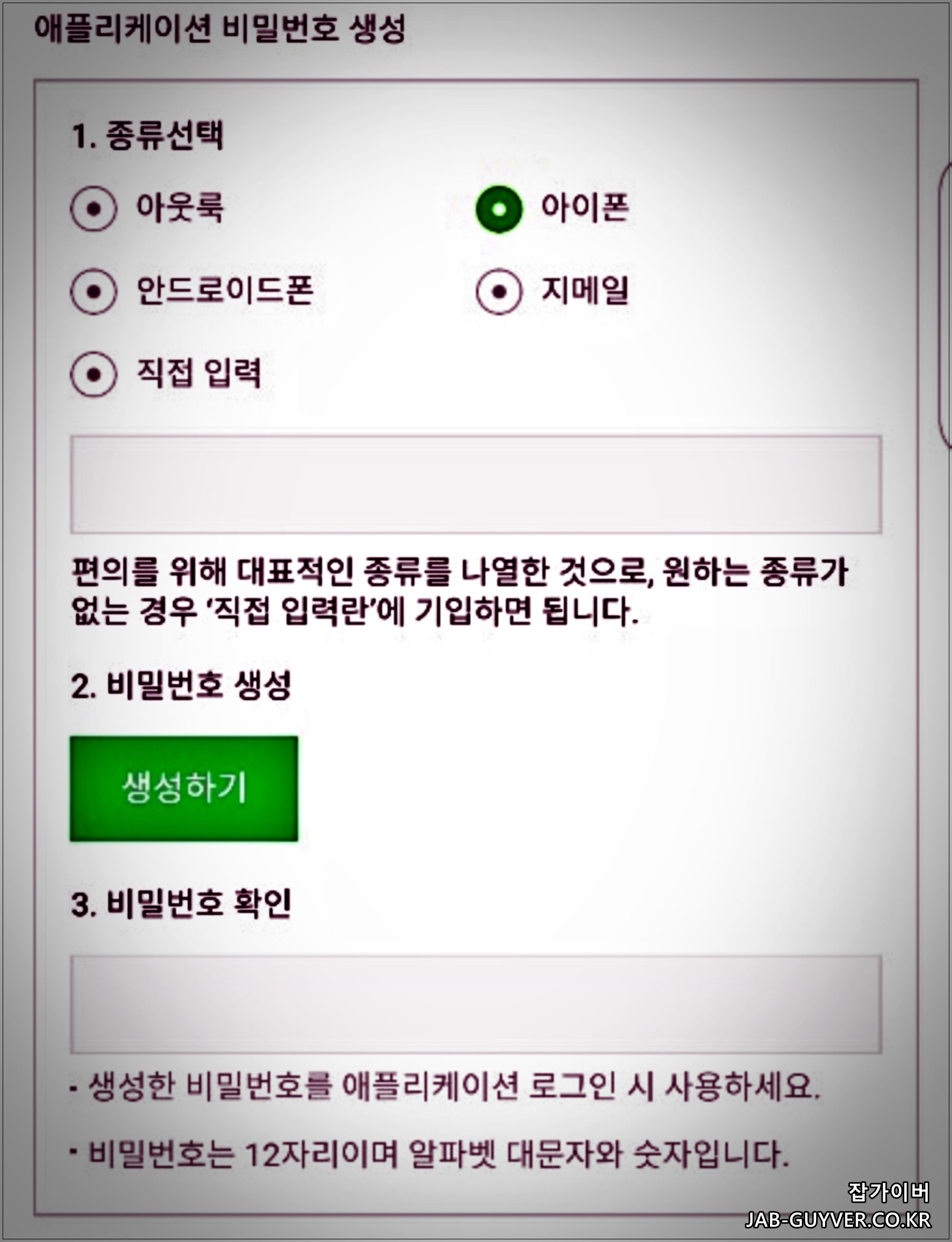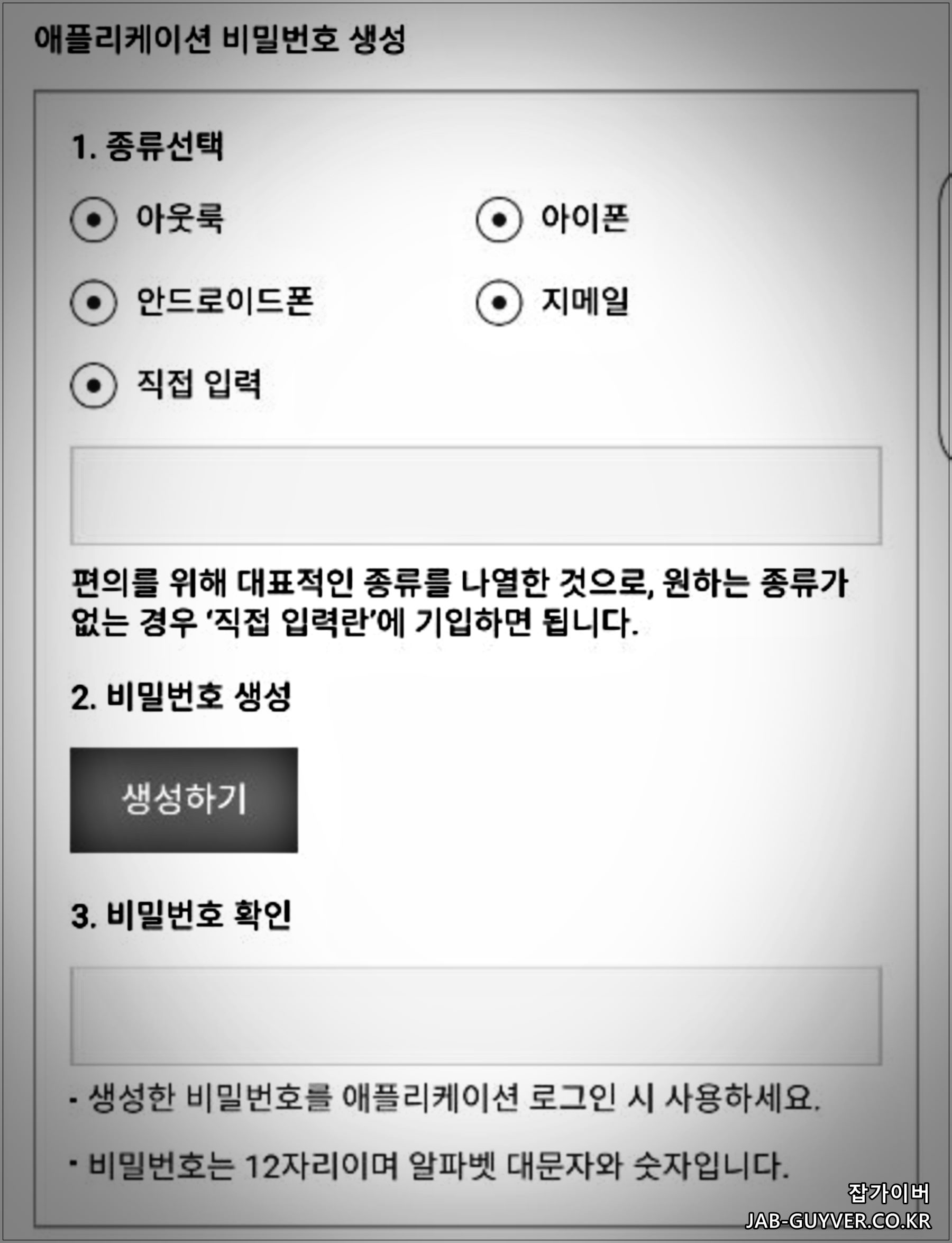 애플리케이션 비밀번호 생성에서 아웃룩, 아이폰, 안드로이드폰, 지메일등을 선택해서 비밀번호를 생성할 수 있습니다.