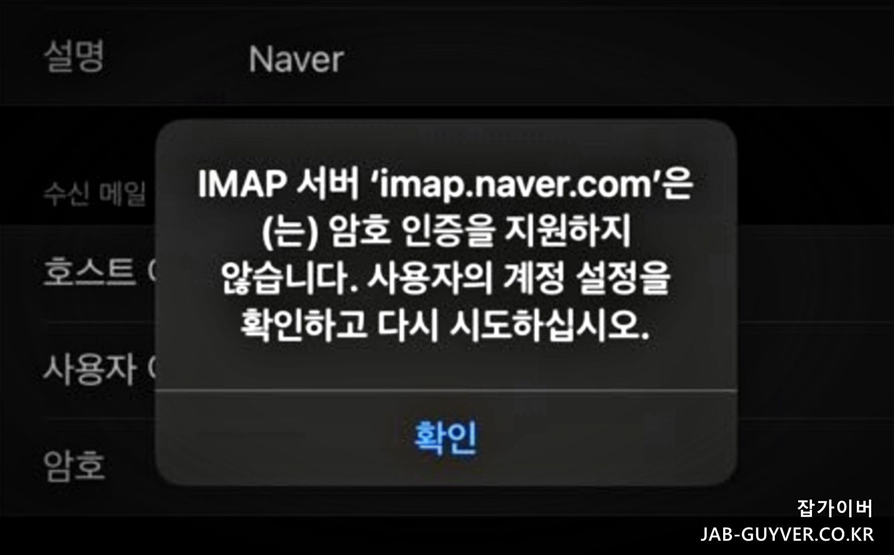 4가지 정보를 입력하고 확인을 누르면 네이버의 IMAP 서버인증이 지원하지 않는다고 표시됩니다.