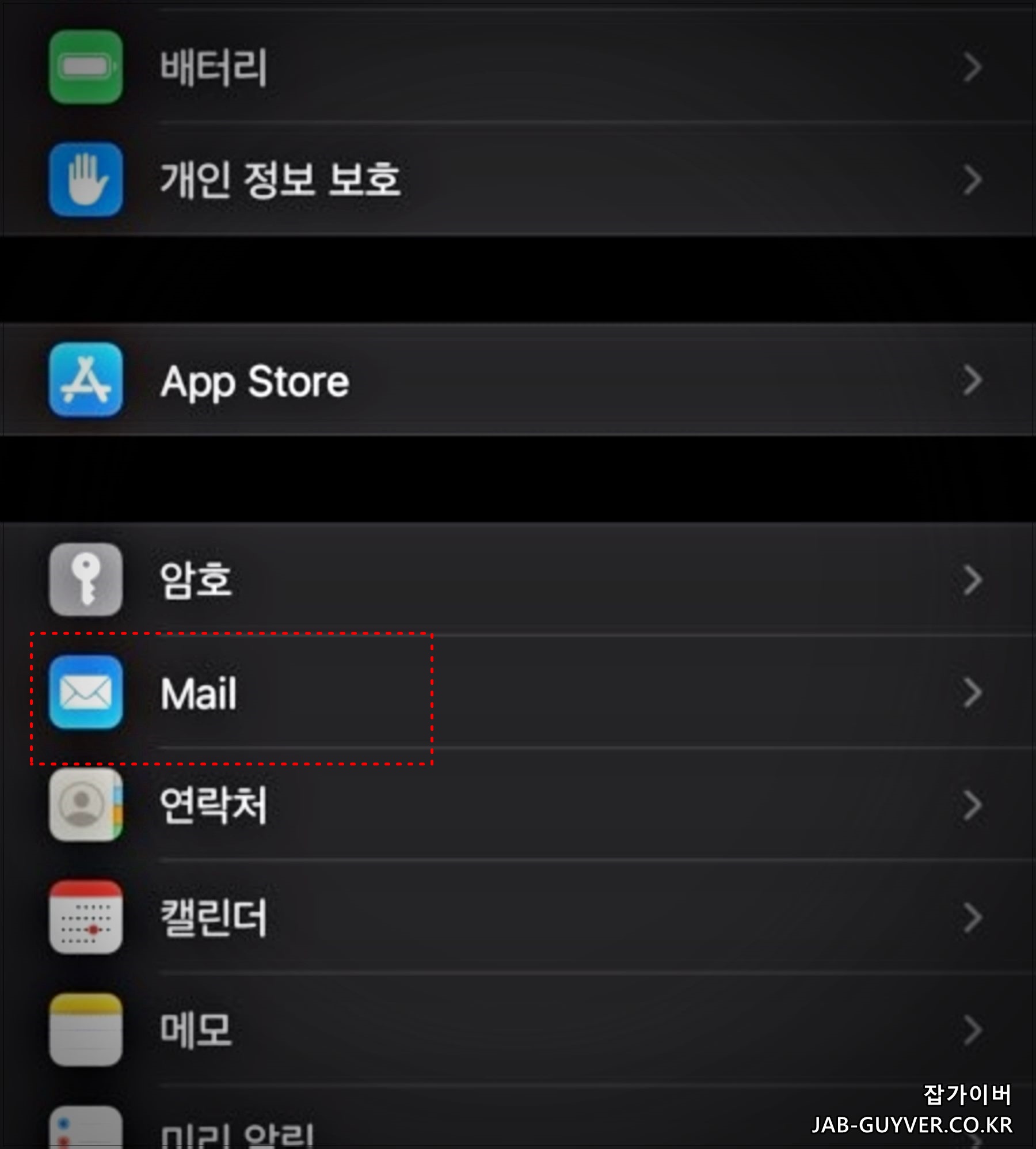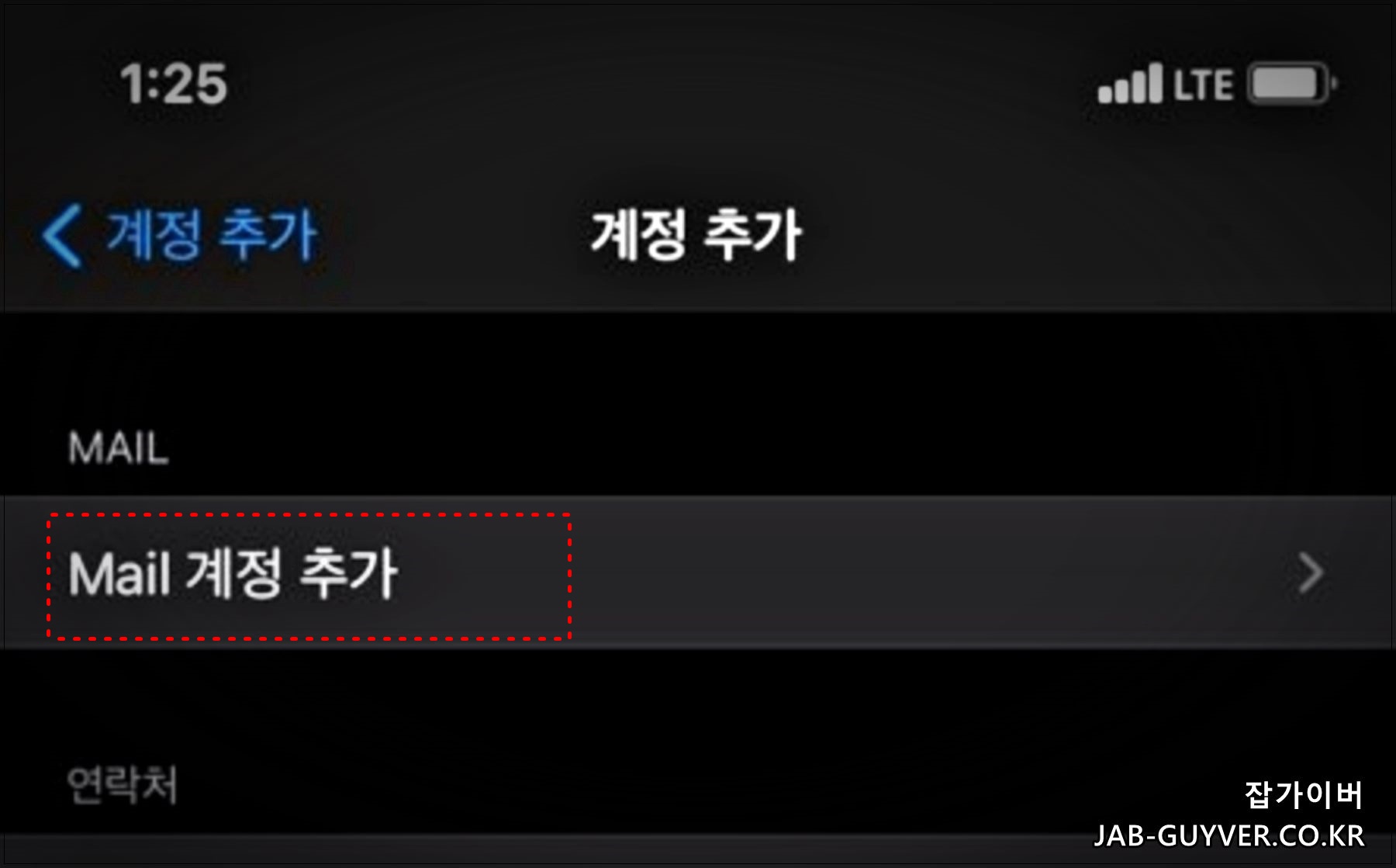 이후 아이폰 설정 -> 메일 -> 계정 -> 계정추가를 선택합니다.