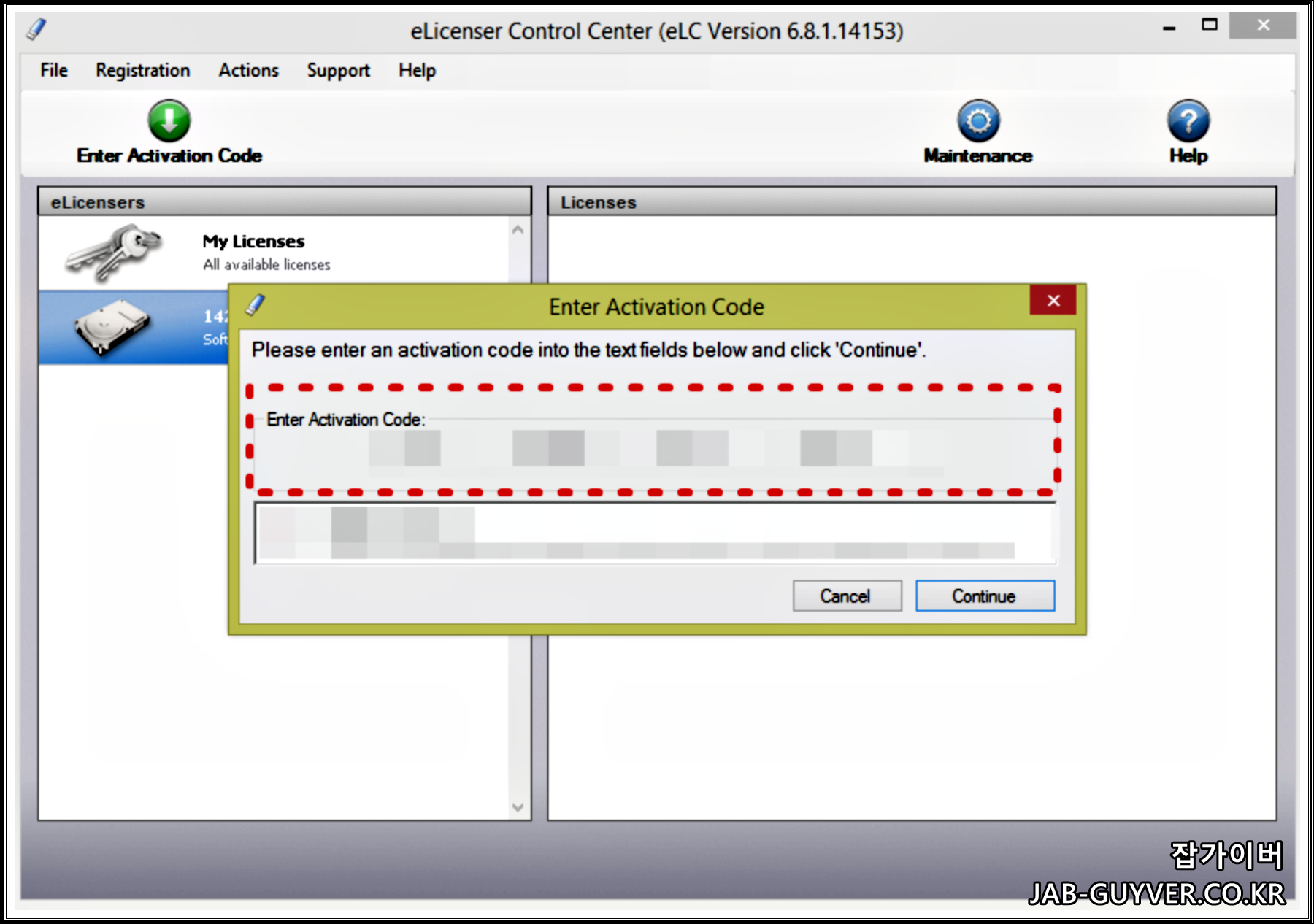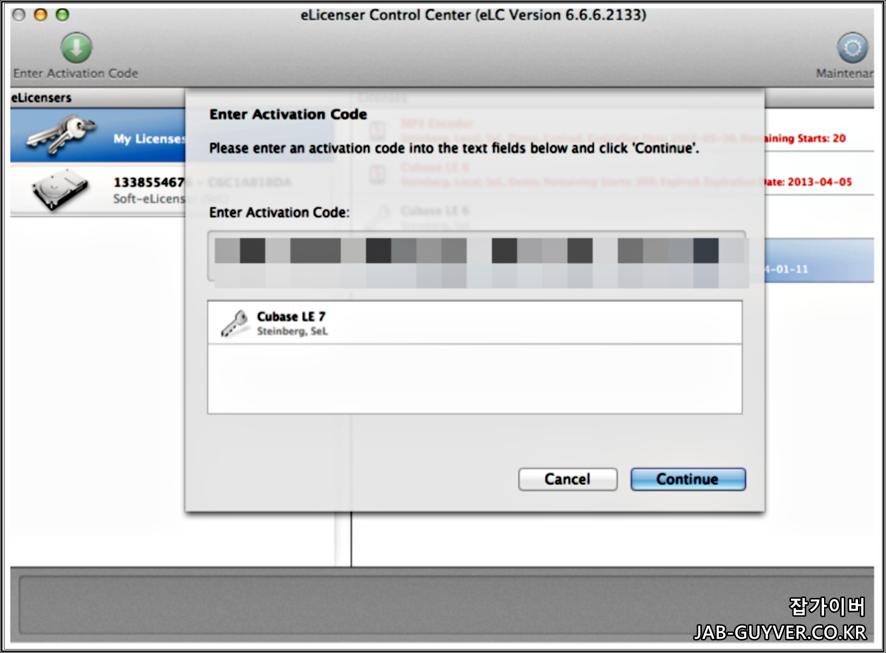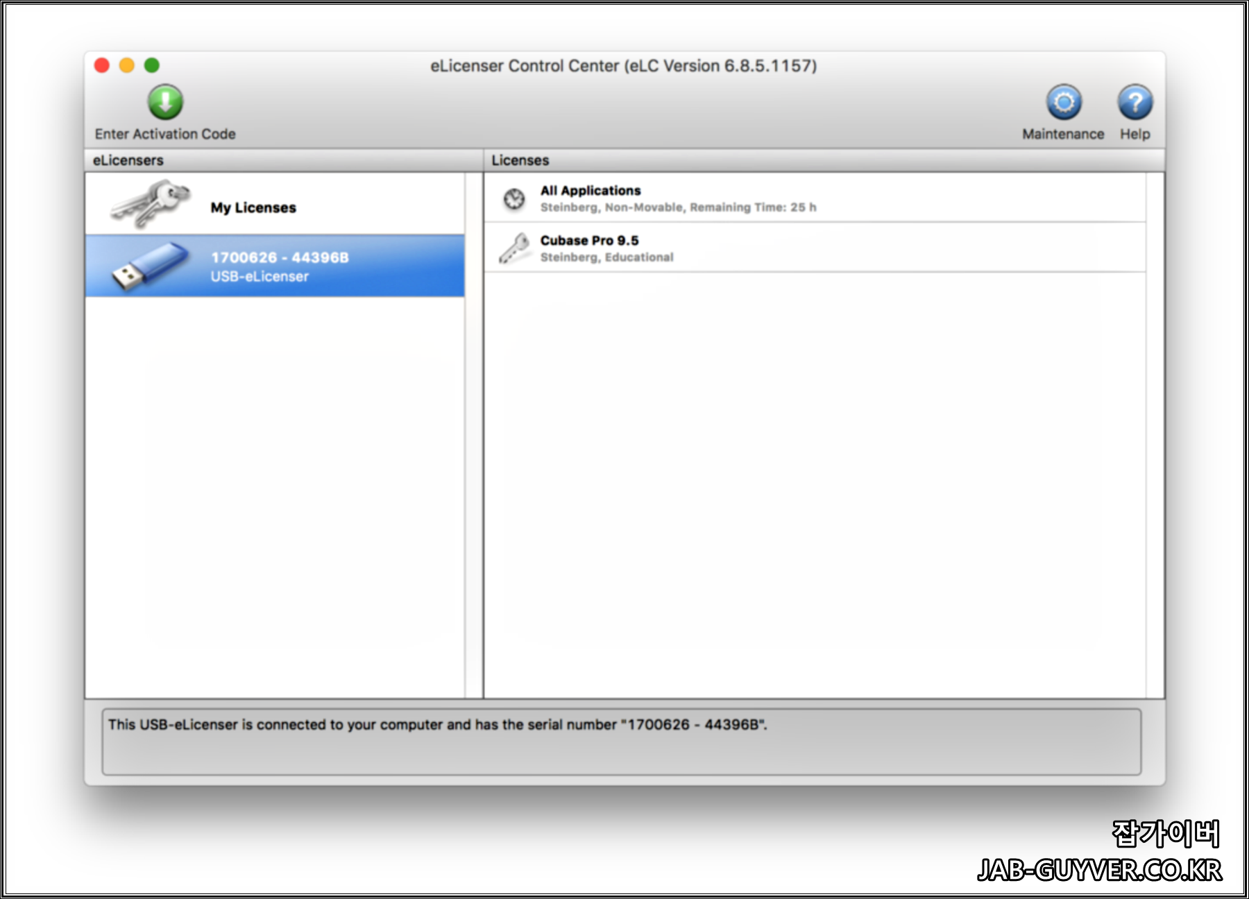 eLicenser Control Center에서 Enter Activation Code 버튼을 눌러 정식으로 구입한 큐베이스 제품 키를 입력하면, 해당 라이선스가 동글로 내려와서 목록에 표시됩니다. 이 작업 자체는 지금 기준으로는 더 이상 새 라이선스에는 사용되지 않지만, 동글 안에 이미 들어 있는 라이선스가 제대로 보이는지 확인할 때 같은 화면이 쓰입니다.