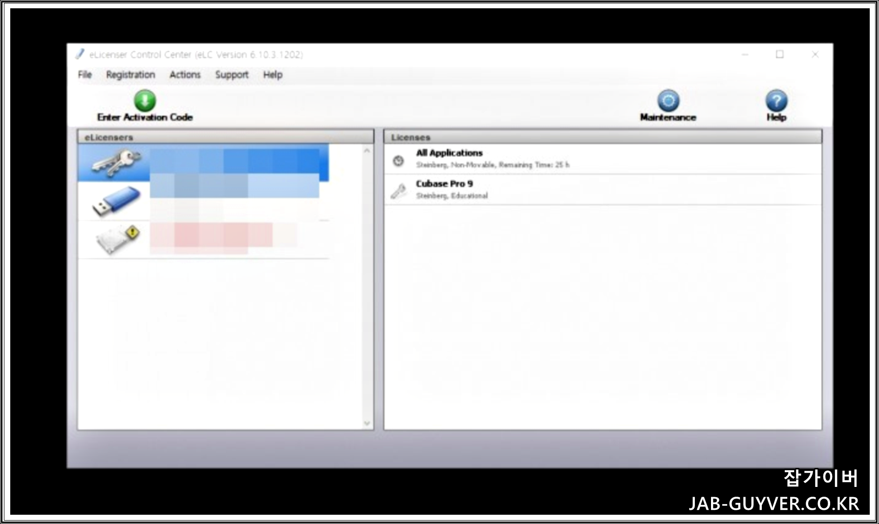 프로그램을 실행하면 연결된 USB-eLicenser 목록과 그 안에 들어 있는 라이선스가 오른쪽 패널에 표시되고, 예전에는 여기서 유지 관리 작업(Maintenance)을 눌러 서버와 동기화를 자주 해주는 것이 중요했습니다.