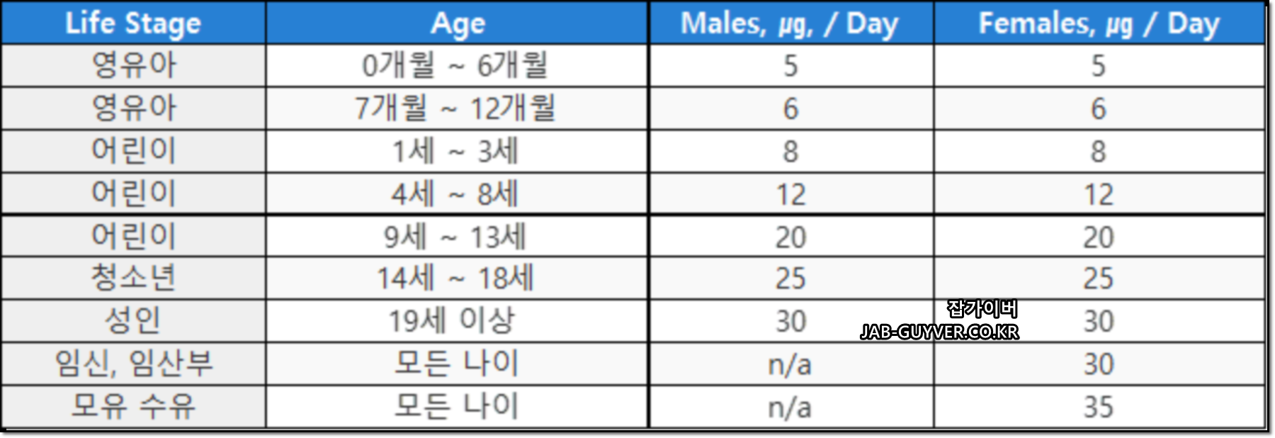 기본적으로 비오틴 영양제의 권장섭취량은 아래 표를 참고하세요
