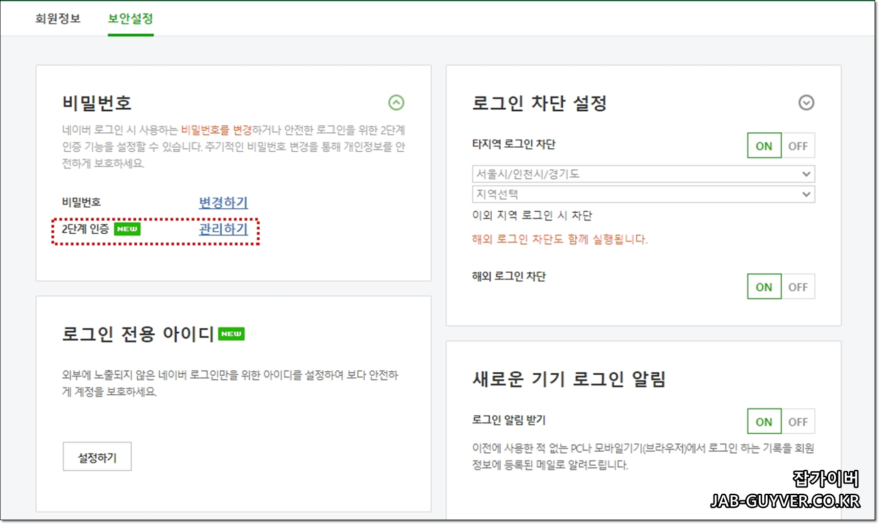 네이버 내정보 -> 보안설정 -> 2단계 인증 관리하기를 선택합니다.