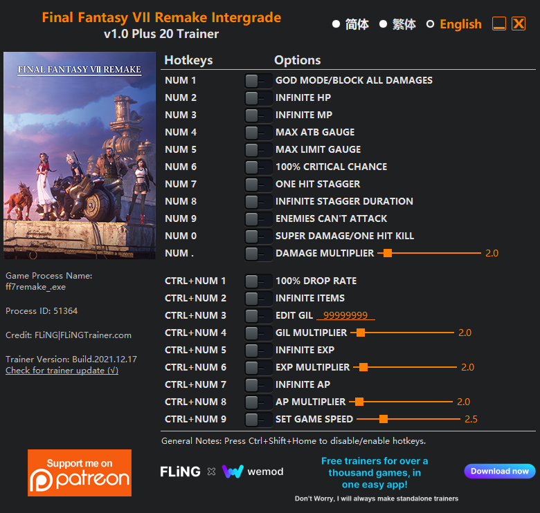 파판7 트레이너 옵션 설명 (단축키 비활성/활성화 - Ctrl+Shift+Home)