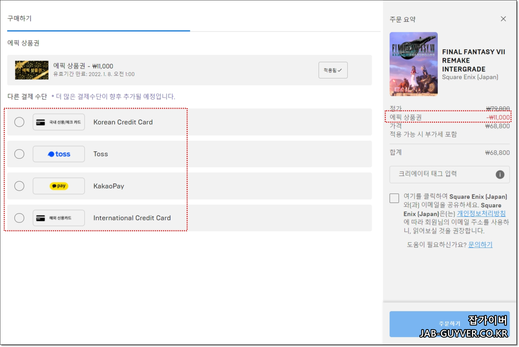 그리고 이때 에픽상품권을 통해 1만1천원 할인권을 사용해서 파판7 리메이크를 결제했습니다.