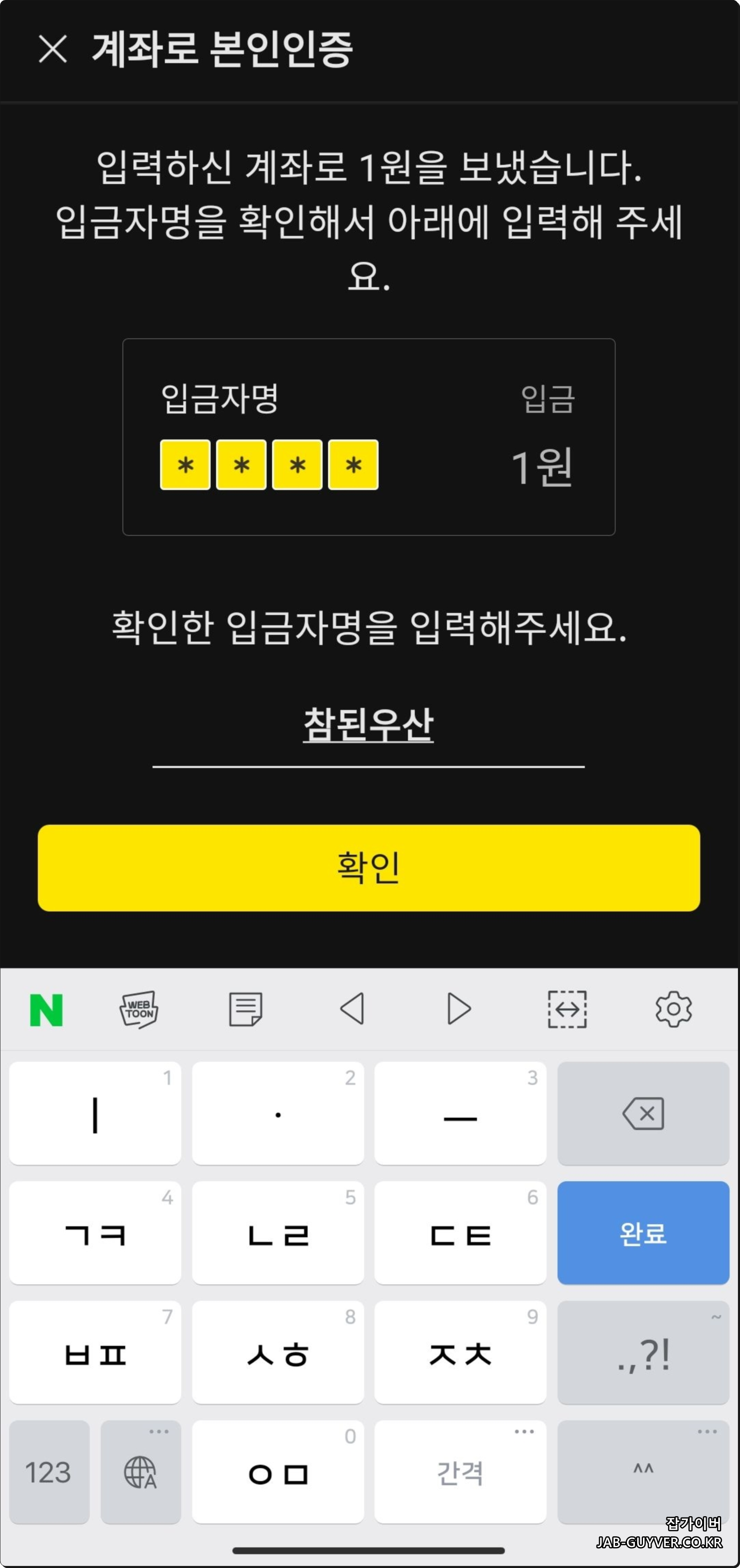 이후 본인명의의 은행계좌번호를 등록해서 해당계좌로 1원이 전송되는것을 확인합니다.