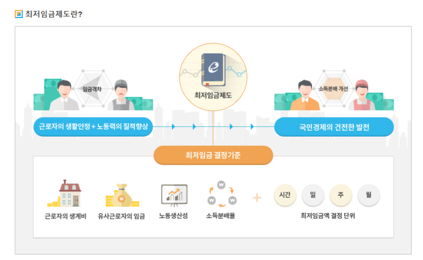국가 간 노/사 간의 임금 결정 과정에 개입하여 임금의 최저 수준을 정하고, 사용자에게 이 수준 이상의 임금을 지급하도록 법으로 강제함으로써 저임금 근로자를 보호하는 제도를 말합니다.