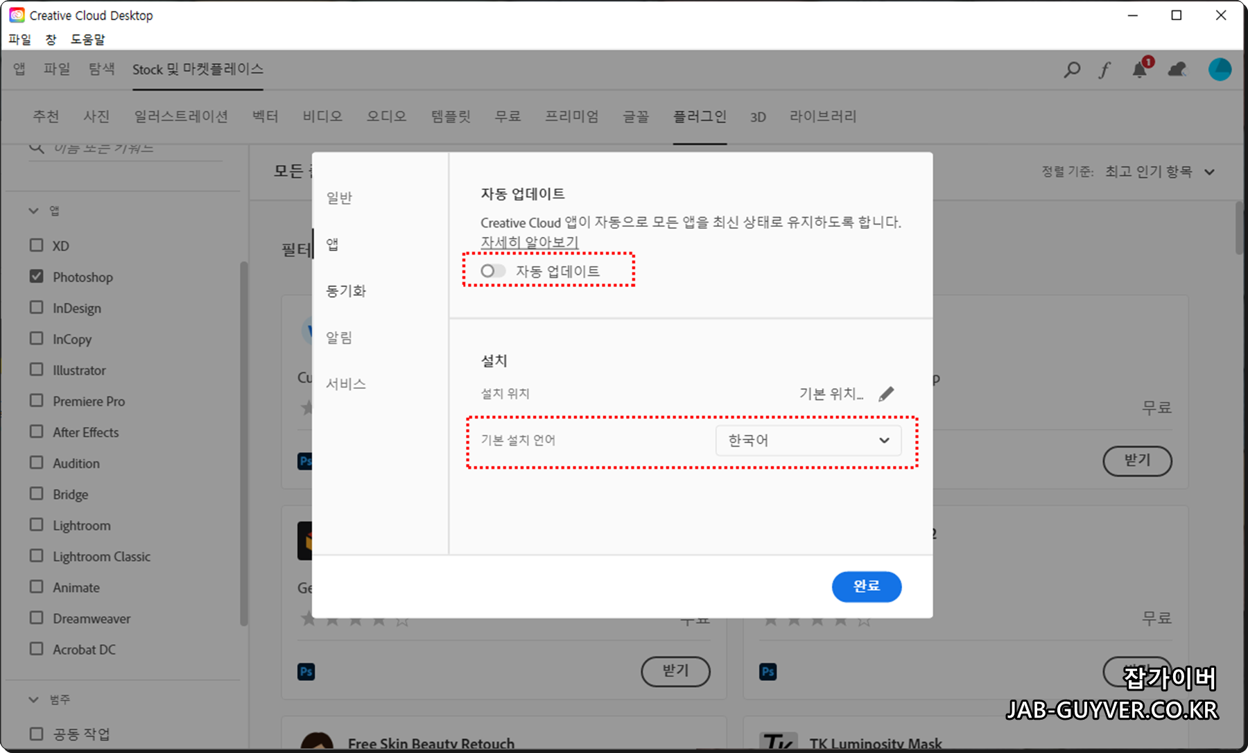 이렇게 설치한 프로그램은 기본적으로 윈도우 운영체제 언어와 같은 한글버전이 설치되지만 영어나 중국어 일본어등 각 나라의 언어로 변경하고 싶다면 Creative Cloud 앱을 통해 언어 설정변경 및 업데이트 허용 및 차단이 가능합니다.