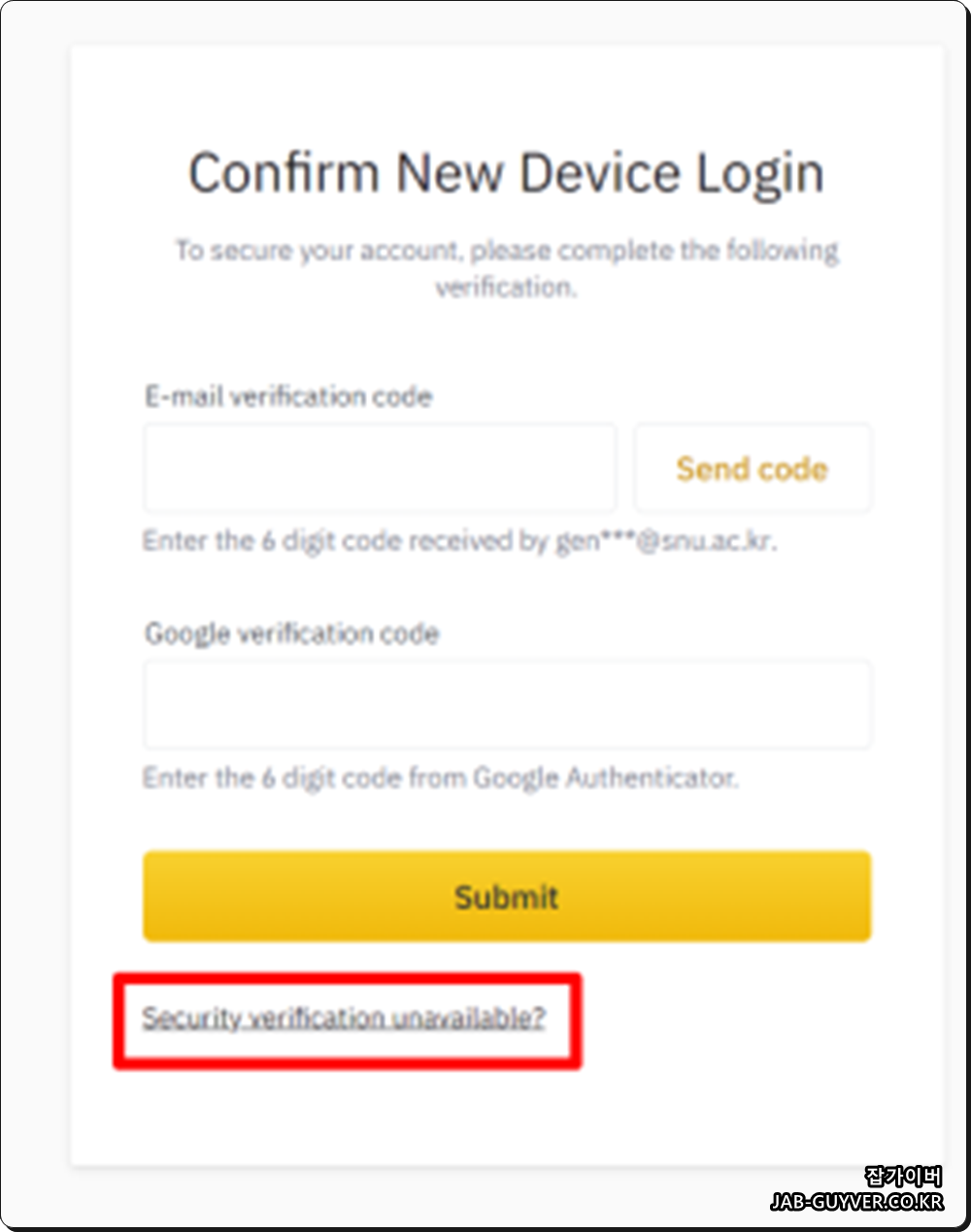 | 1단계 | 바이낸스 로그인 시도 후 Security verification unavailable 클릭 | 계정 이메일/비밀번호 | OTP 인증 불가 상태에서만 해당 버튼이 표시됨 |